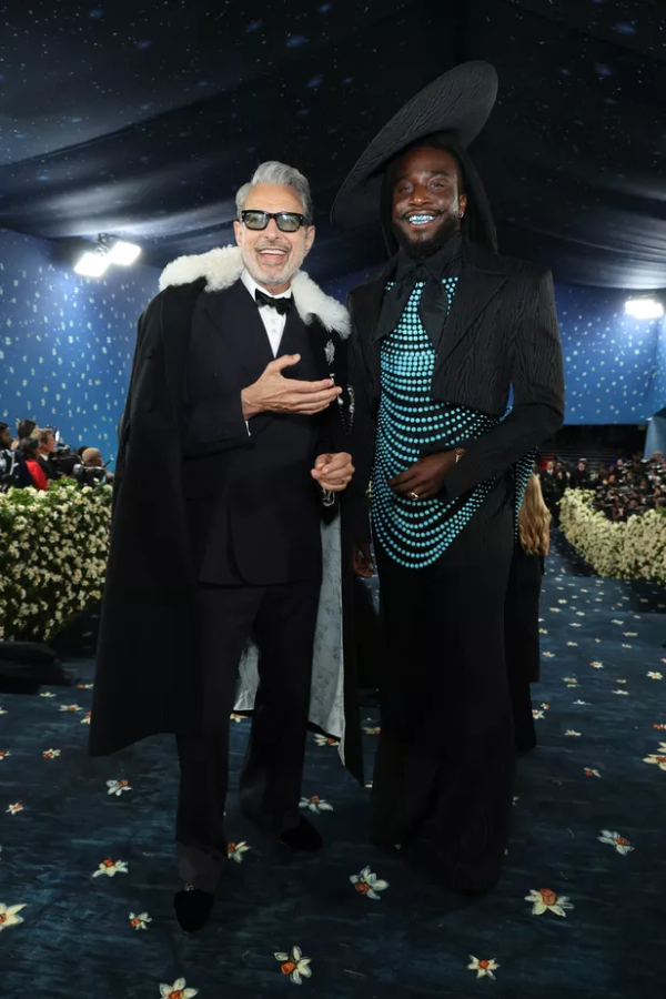 ジェフ・ゴールドブラムはウェールズ・ボナーとスワロフスキーのジュエリーを身につけ、シャブージーと共に2025年METガラに登場。(ニューヨーク、2025年5月5日)photography: Kevin Mazur/Getty Images