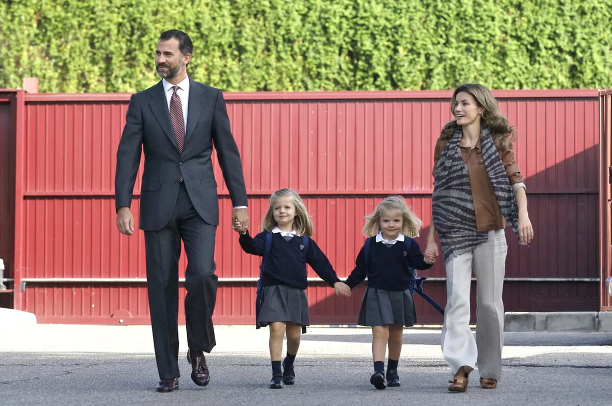 サンタ・マリア・デ・ロス・ロサレス校へ通学するソフィア王女とレオノール王女、つきそうスペイン国王フェリペ6世とレティシア王妃。(マドリード、2010年9月14日)photography: Almagro/ABACA