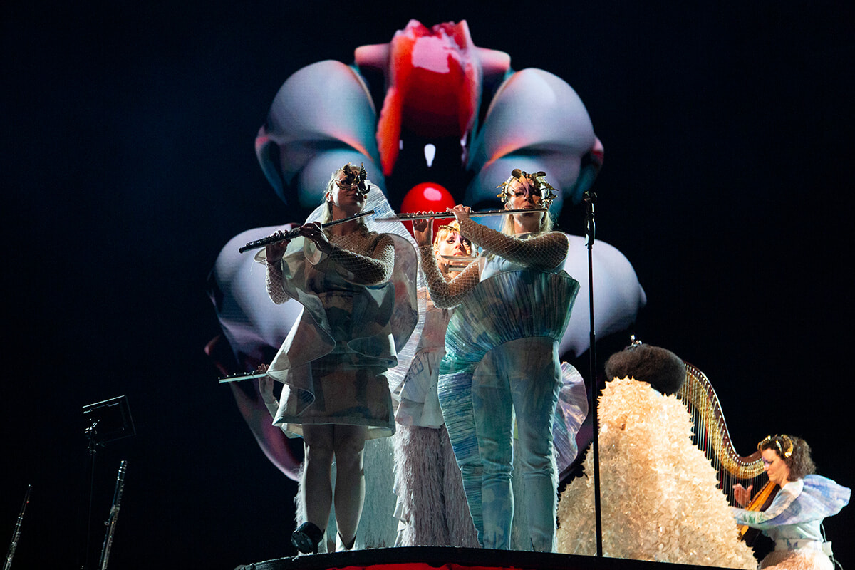 今年1月に行われたApple Music 1のザイン・ロウのインタビューで、ビョークはコンサートでの見どころとして、「フルート7重奏団のヴィーブラはグループの一体感、友情、音楽的なシナジーを育み、時にはアルバムの核心となり、その全体的なサウンドと感情のトーンを形作っているの」と話している。そもそもフルートはビョークが最初に手にした楽器であり、当時はおもしろみを感じず興味がドラムへと移ったものの、「シンガーとしての呼吸法に役立った」と話していた楽器である。スクリーンではそのアイルランドの女性演奏家たちがビョークとともに舞台を華やかに彩る。