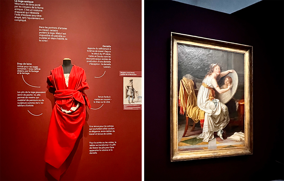 左:トーガについて解説。 右:アデル・ロマネによる自画像(1799年ごろ)。当時流行りのカシミアのショールを椅子にかけ、古代の衣装を纏って娘の肖像画を優美に制作する様を描いている。この時代にあって、女性であり母であっても画家たり得ることをここで主張。photography Mariko Omura