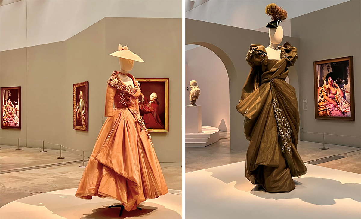 初期のアーティストたちはいかに装っていたのか。そもそもアーティストのための特別な服というのはあるのだろうかという、アーティスト本人たちによる疑問から展覧会はスタートする。そのテーマは「古代ローマのゆったりした長い衣のトーガをまとったアーティストたち:古代アーティストたちの幻想」。職人と区別を示すべく、18~19世紀において芸術家たちは古代の衣装を着て制作をしていたそうだ。当時の画家の肖像画や自画像が展示されると同時に、古代の衣服への憧れはクチュリエたちにおいては21世紀のいまにも言えることとして、ディオールの2020年のクリエイションも展示している。
