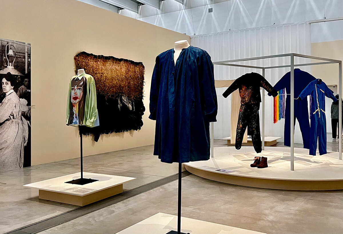 作業衣のテーマの部屋の展示は、青い上っ張りを着て画布に向かうローザ・ボヌールの肖像から始まる。photography: Mariko Omura