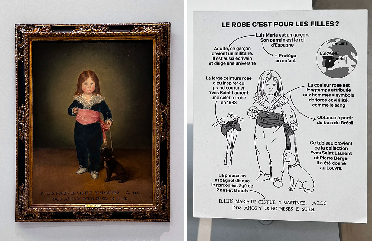 左:イヴ・サンローランが所有し、お気に入りだったゴヤの『ルイス・マリア・ドゥ・システィエ・エ・マルティネスの肖像』。”青い服の子供”と呼ばれる作品は、ピエール・ベルジュからルーヴル美術館に寄贈された。クチュリエに多大なるインスピレーションを与えた作品だ。現在、ギャラリーで展示中。 右:このギャラリーの1つの特徴は、作品ごとにこのようなイラスト付きの解説がつけられていることだ。photography: Mariko Omura
