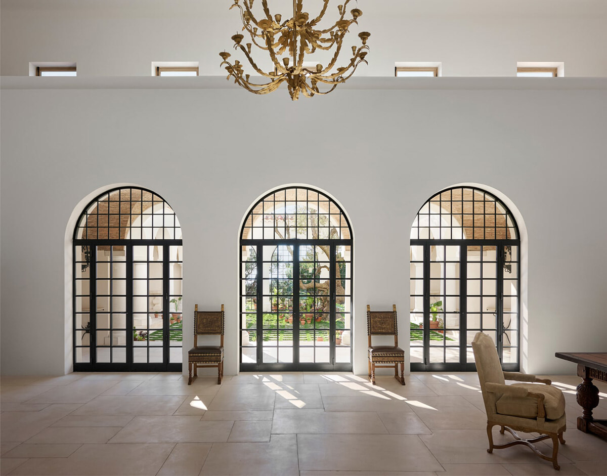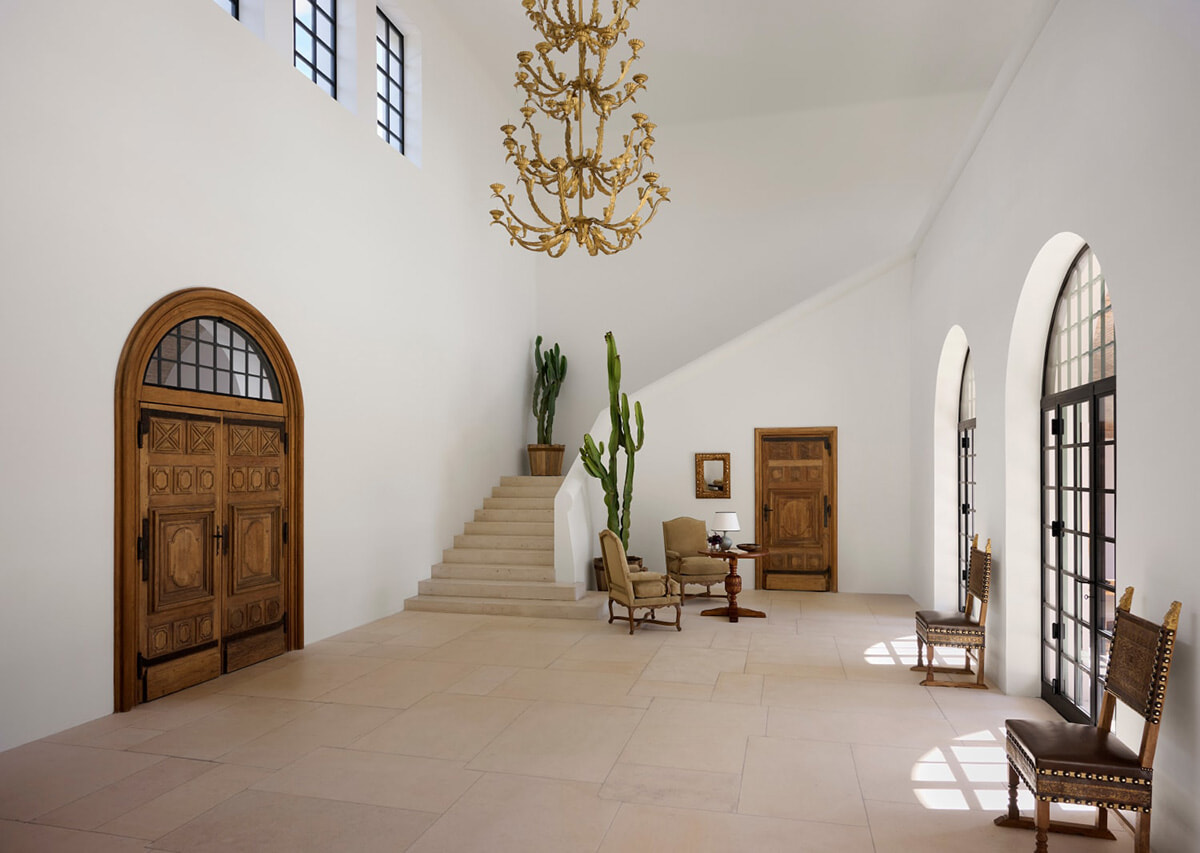 扉を開けると、白を基調にした静謐かつエレガントな空間が目前に広がる。素朴な白壁や床など、全体的に色や装飾を抑えたミニマルな内装。それによって、十字アーチ型の窓や扉、伸びやかなスロープ階段など、建築自体の持つ優美なラインが際立っている。また、窓から差し込む光の美しさにも目を奪われる。そんなモダンな空間に、18世紀の燭台や金箔が施された鉄製シャンデリアなど、バロック様式の調度品がほど良い温もりを添えている。