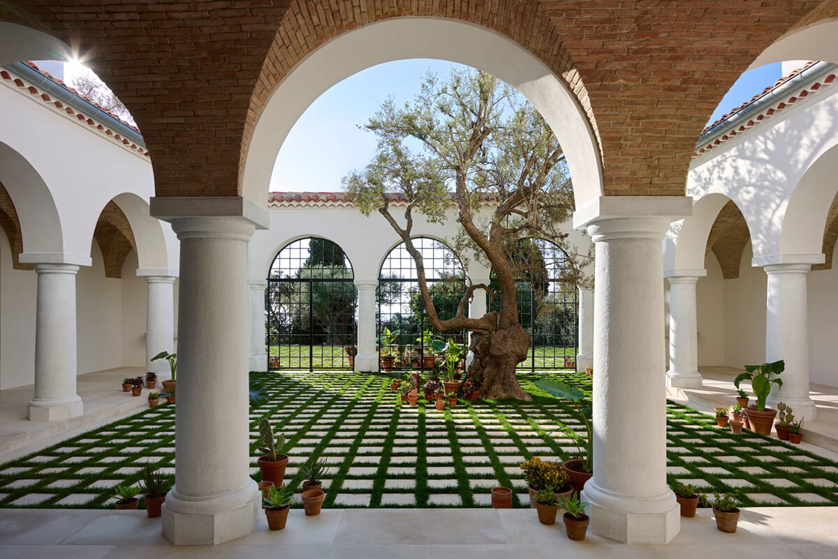 丹精に整えられた芝生のパティオ。中央にあるオリーブの木はそのまま手を加えず配置。©CHANEL