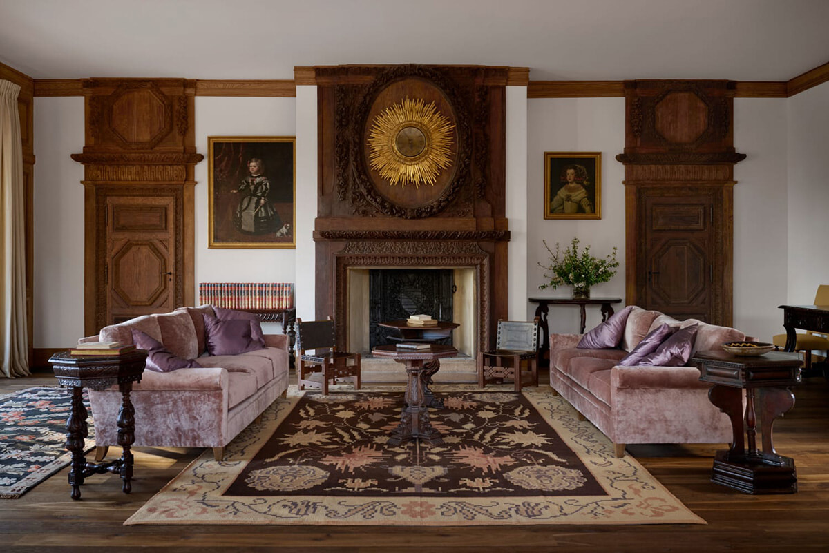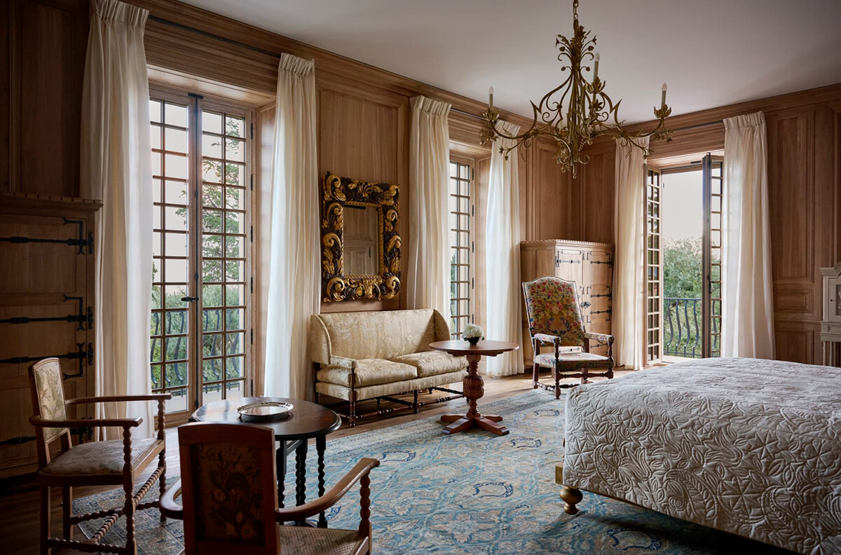 書斎の壁は落ち着いたブラウンのオーク材パネルで覆われているが、これはスコットランドの城にインスパイアされたもの。ダークな色調の木製家具やベルベットのソファ、ペルシャ絨毯など、16世紀から17世紀のスペインのバロック様式インテリアによって、さらに重厚な雰囲気を纏っている。バルトロメオ・ベッテラによって描かれた静物画をはじめ、アート作品も空間に華を添えている。書斎横の大広間は、かつてシャネルが友人たちとパーティや仮装舞踏会を行なっていた場所。今回の修復で、このスペースにあったピアノも再現した。