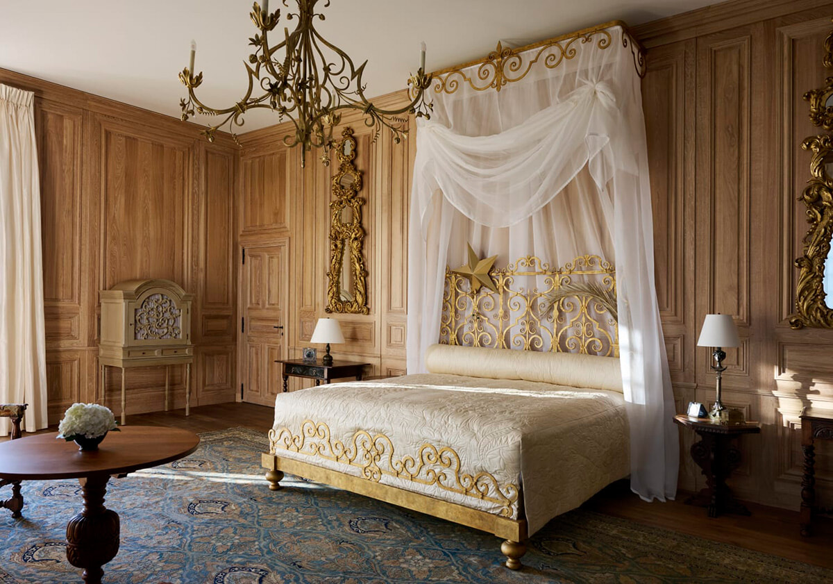 西棟2階のベッドルームは、ゲストが立ち入ることのできないシャネルの聖域。唯一、立ち入ることができたのは恋人のウェストミンスター公爵だけだったという。天蓋付きのヴェネツィア様式のベッドに星が飾られている部分まで、当時のままだ。両サイドにバロック調の鏡が取り付けられ、三面鏡付きのドレッサーも作り付けで配されている。ベッドルームから続くバスルームも圧巻だ。全面鏡張りの広々とした空間に、大きなバスタブと洗面室が並んでいる。あらゆる角度から自分の姿を映せるよう設計されたこのバスルームは、シャネルの美に対する揺るぎない姿勢を物語っている。