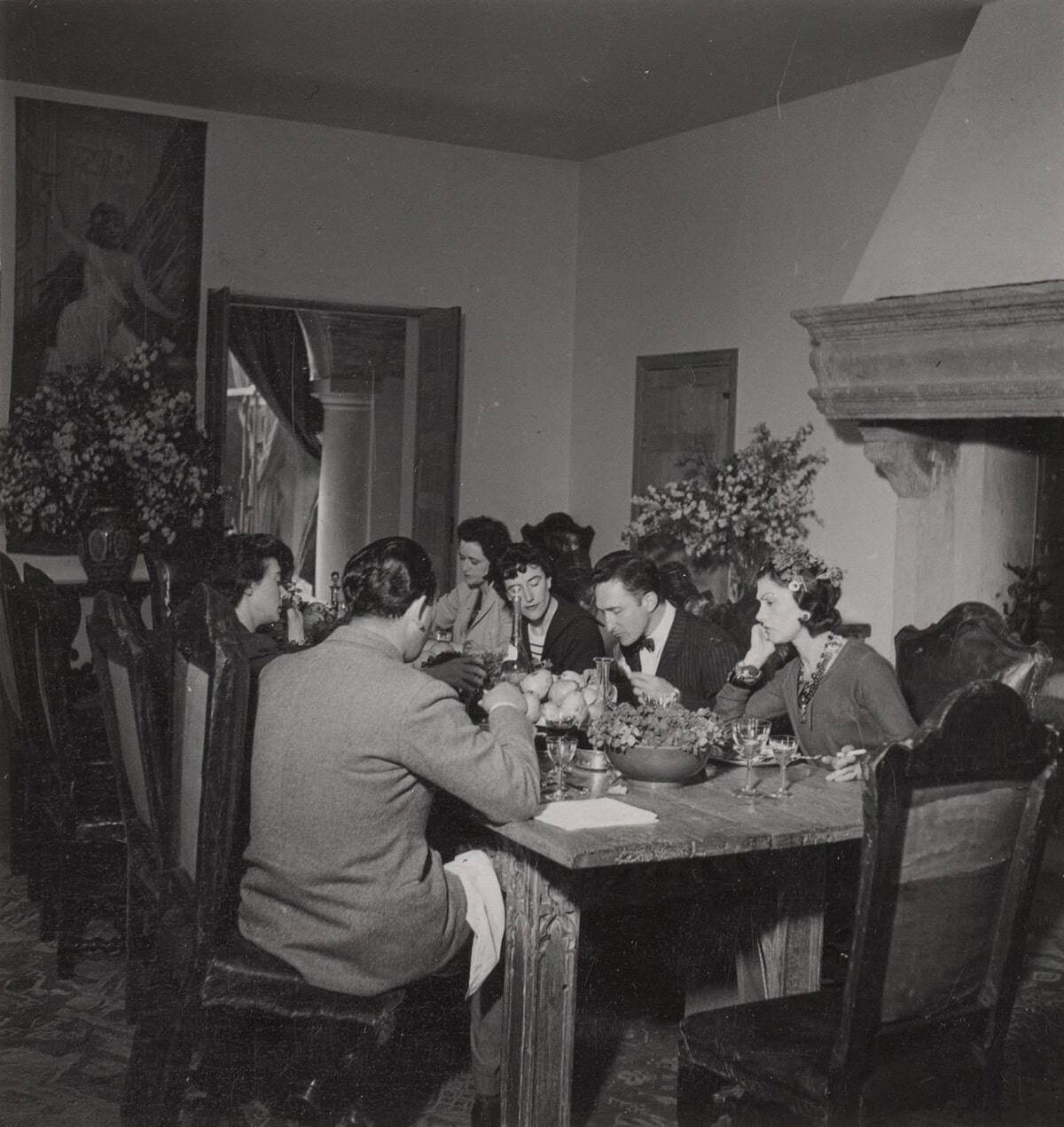 食卓を囲んでおしゃべりに興じるシャネルと友人たち。敷地内のテニスコートでテニスをしたり、ビーチで泳いだり、スポーツを楽しむことも。photography: Roger Schall © Schall Collection