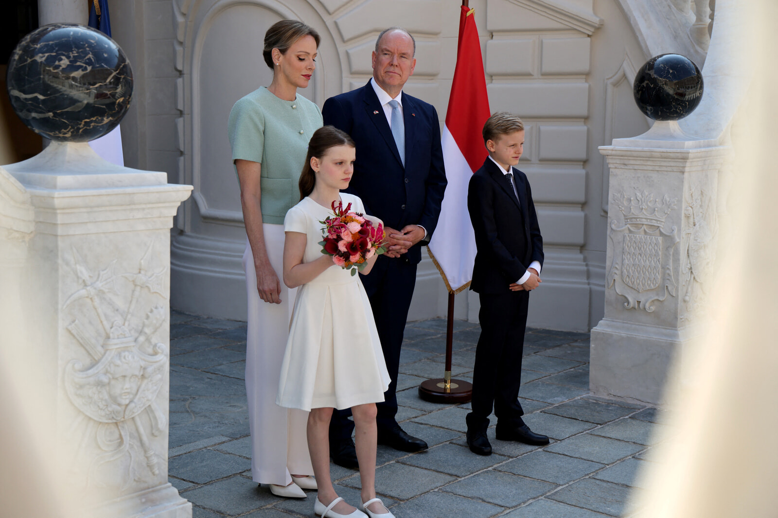 もちろん、その日、名門ブランドの服やアクセサリーに身を包んでいたのはガブリエラ公女だけではなかった。アルベール2世はブルーのスーツで控えめな装いを選んだものの、シャルレーヌ公妃は存在感あるブランドの装いで輝いていた。47歳の元南アフリカ代表の競泳選手であるシャルレーヌ公妃が選んだのは、ダイアン・フォン・ファステンバーグのテラコッタカラーのロング丈プリントドレスに、フェンディの「バゲット」サングラス。一方、息子のジャック公子は全身をブルネロクチネリでまとめていた。このブランドは「クワイエット・ラグジュアリー」の代表格として、シリコンバレーでも人気を集めている。
