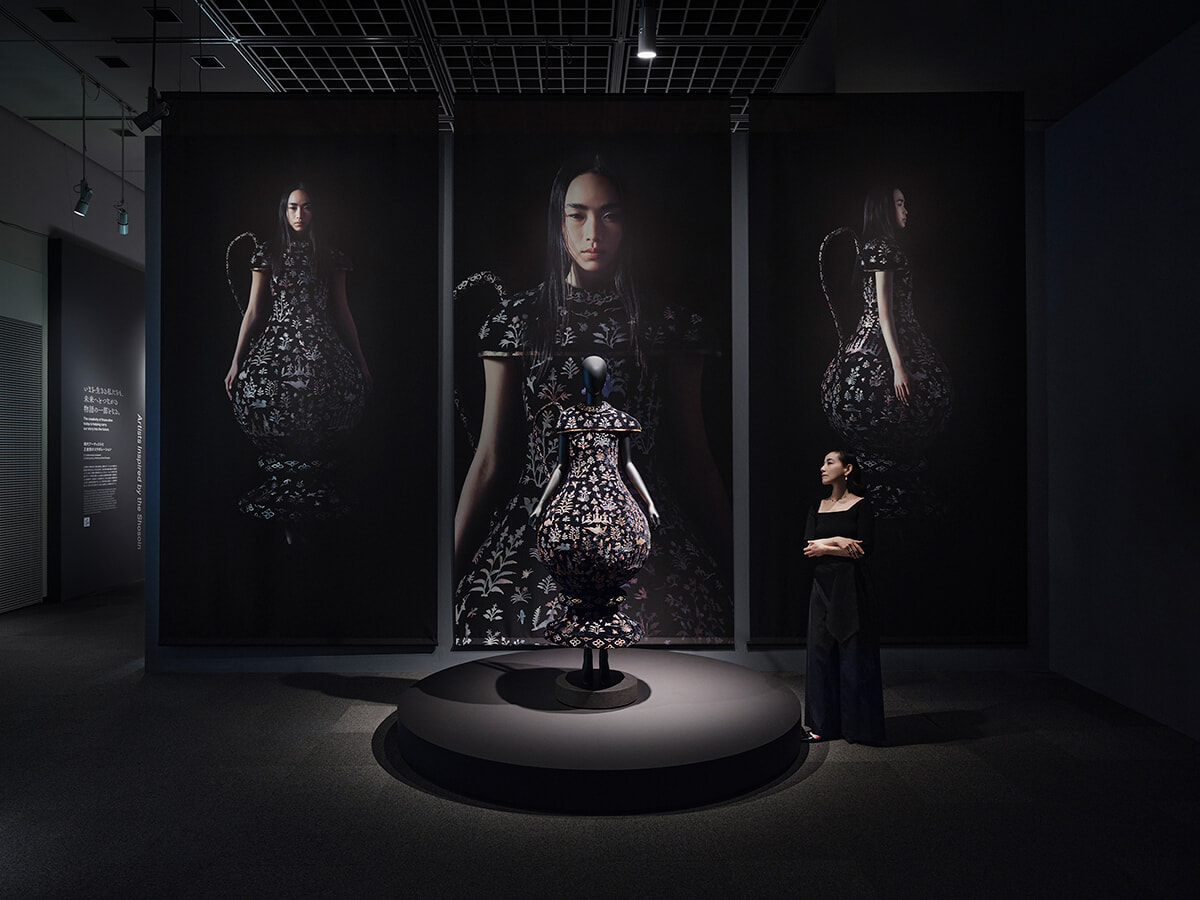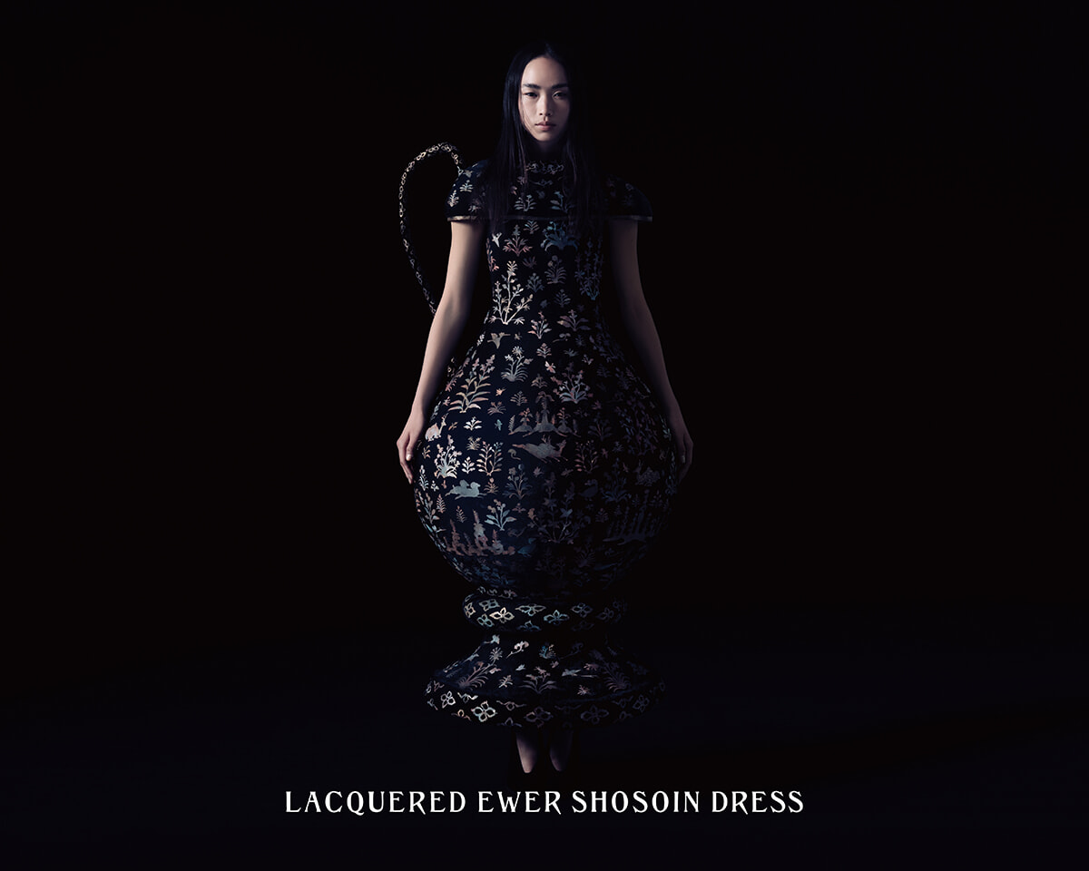 この正倉院宝物を、纏うアートピースの象徴としてファッションへと昇華させました。作品名は「LACQUERED EWER SHOSOIN DRESS」。職人技術の粋を集めた古代の水瓶は、時を超えた美意識とおおらかな大陸の流れを感じさせその歴史に魂が震えました。守り残された記憶をなぞり現代へと甦らせるこの手仕事は、過去の職人との創作を通じた会話のようであり、制作者として至福の瞬間でありました。