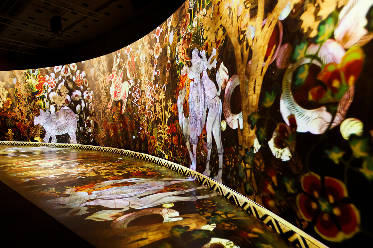 宝物を360度からスキャンして取得された高精細な3Dデジタルデータに演出を施した展示を行い、宝物の細部や質感を実物を鑑賞する以上にリアルに感じることができます。幅約20メートルのスクリーンで上映する世界観は圧巻です。