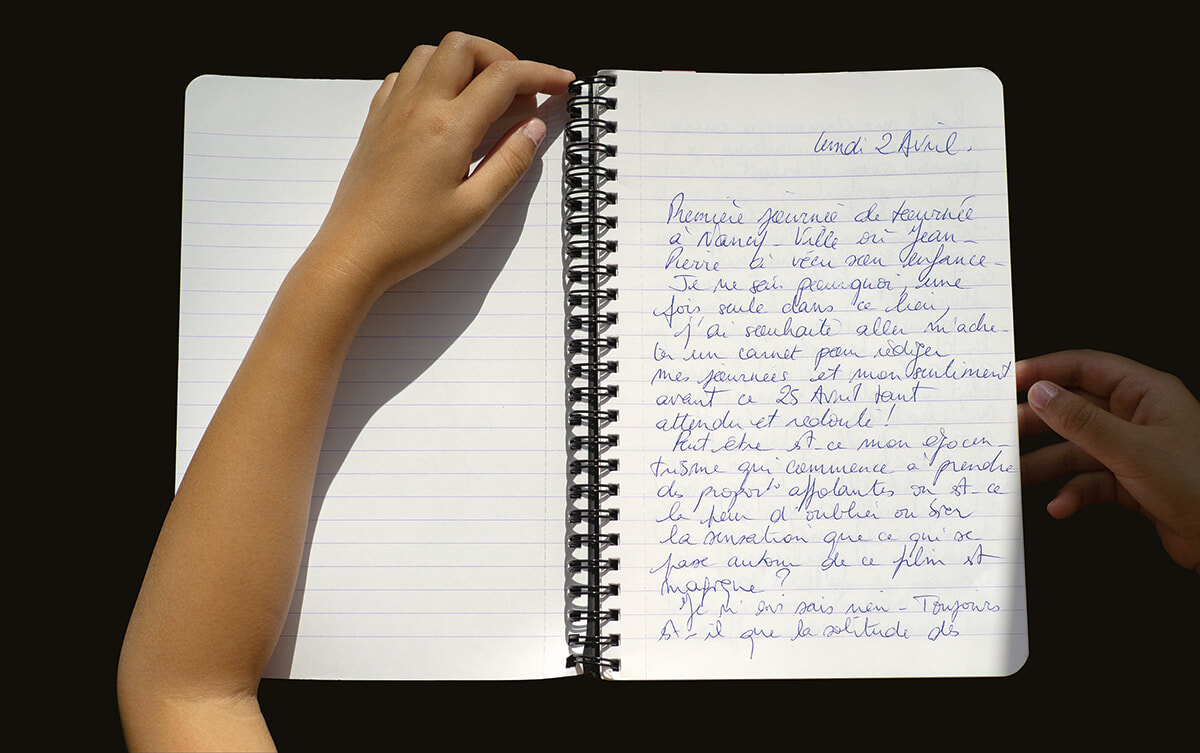 映画の撮影で、フランス北東部のナンシーに滞在中に書いたというノート。ナンシーは映画監督ジャン=ピエール・ジュネの故郷でもある。「4月2日(月)ナンシーでのツアー初日。ここはジャン=ピエールが幼少期を過ごした町だ。なぜだかわからないが、この場所にひとりでいたら、あれだけ心待ちにしつつも恐れていた4月25日を前に、自分の日々や気持ちを書き留めるノートを買いに行きたくなった。恐ろしく肥大し始めた私の自己中心性のせいなのか、それともこの映画の周りで不思議なことが起きているという感覚を忘れることへの恐れなのか。わからない。ただ、孤独は……」