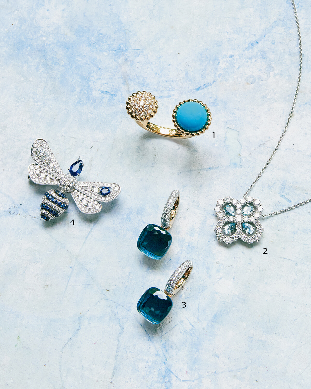 1.ターコイズは健康運や生命力もアップ。リング「ペルレ クルール」(ターコイズ×18KYG ×ダイヤモンド)¥1,755,600/ヴァン クリーフ&アーペル(ヴァン クリーフ&アーペル ル デスク) 2.花は女性の運気全般を上げてくれるモチーフ。ネックレス「ループ・フル モチーフ・ペンダント」 (アクアマリン×PT× ダイヤモンド)¥2,684,000/ハリー・ウィンストン(ハリー・ウィンストン クライアントインフォメーション) 3.ドロップイヤリングは 良縁を招く力も。イヤリング「ヌード」(ロン ドンブルートパーズ×18KWG×18KRG×ダイヤモンド)¥1,045,000/ポメラート (ポメラート クライアントサービス) 4.品格やステータスをもたらすブルーサファイア。 アベイユ ブローチ「アトラップ モワ コレクション」(サファイア×WG×ダイヤモンド)¥3,883,000/ショーメ
