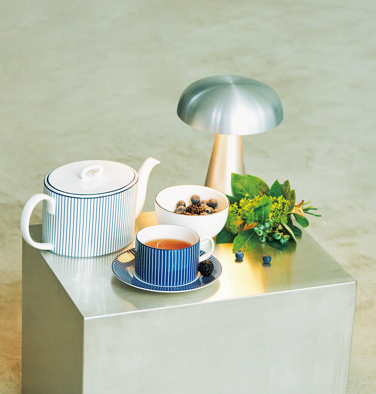 小さなランプの優しい光と優雅なティーセットが一日の締めくくりを豊かなものにし、心を満たして運気を育んでくれる。ポータブルランプ「コモSC53」¥46,200/アンドトラディション(林物産) 「ジオブルー」ティーカップ&ソーサー ピンストライプ ブルー¥11,000、同 ティーポット ピンストライプ ホワイト¥33,000、同ボウル 11cm ライン(φ11cm)¥4,950/以上ウェッジウッド