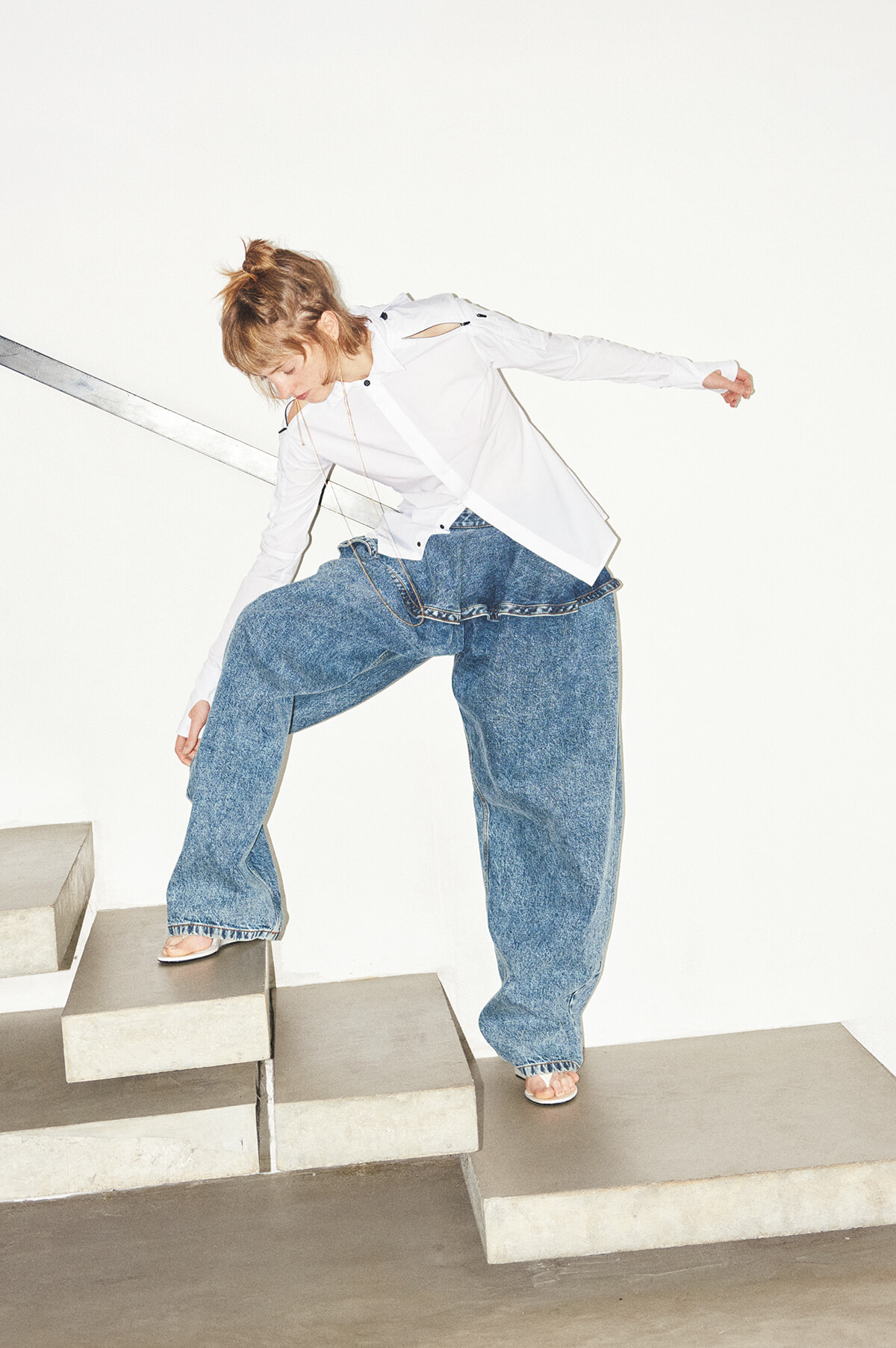 たっぷりとしたシルエットが、今年らしさを主張するデニム。伸縮性のあるテック素材と肩のスリットがスポーティなシャツを合わせて、トレンド感のあるエフォートレスな装いに。トップ¥115,500/ヨハンナ パーヴ(ドーバー ストリート マーケット ギンザ)、デニムパンツ¥276,100、サンダル¥169,400、チェーン ピアス¥140,800/以上アライア(リシュモン ジャパン アライア)