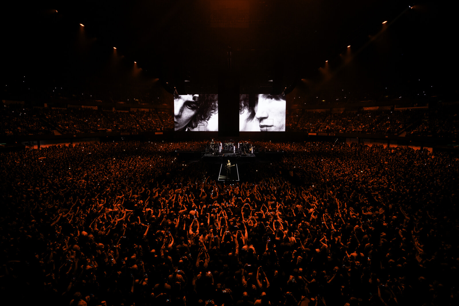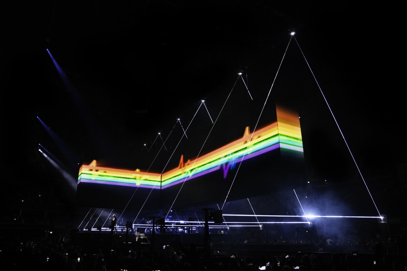 ロジャー・ウォーターズの「予知能力」「勇気ある撤退」といったソロ曲と、ピンク・フロイド時代の「あなたがここにいてほしい」「マネー」「アス・アンド・ゼム」といった名曲を新たなアレンジでうまく組み合わせているので、音楽的に存分に楽しめる。そして、何より圧倒されるのはそのステージセットだろう。ピンク・フロイド時代から豚が頭上を飛ぶなど、意味を持たせた舞台演出にも凝っていたが、ここでは会場を360度見渡せる中央にステージを設置し、その上にステージを十字に区切る巨大LEDスクリーンが登場、メッセージや戦地など現代の映像を映し出すことでリアリティを突きつけてくる。
