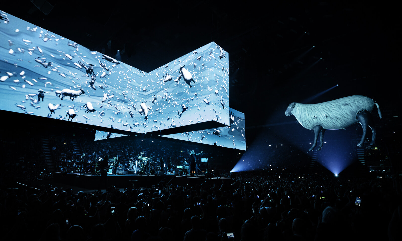 「シープ」では支配者層に従順な一般大衆を羊にたとえ、羊の風船とともに、「資本主義に抵抗せよ」といった直接的なメッセージがスクリーンに映し出される。