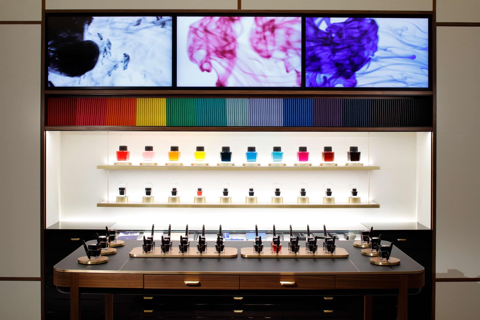モンブラン銀座 本店2階スペース内の約20色のインクが常時試せる「インクバー」付近でトークショーは行われる。