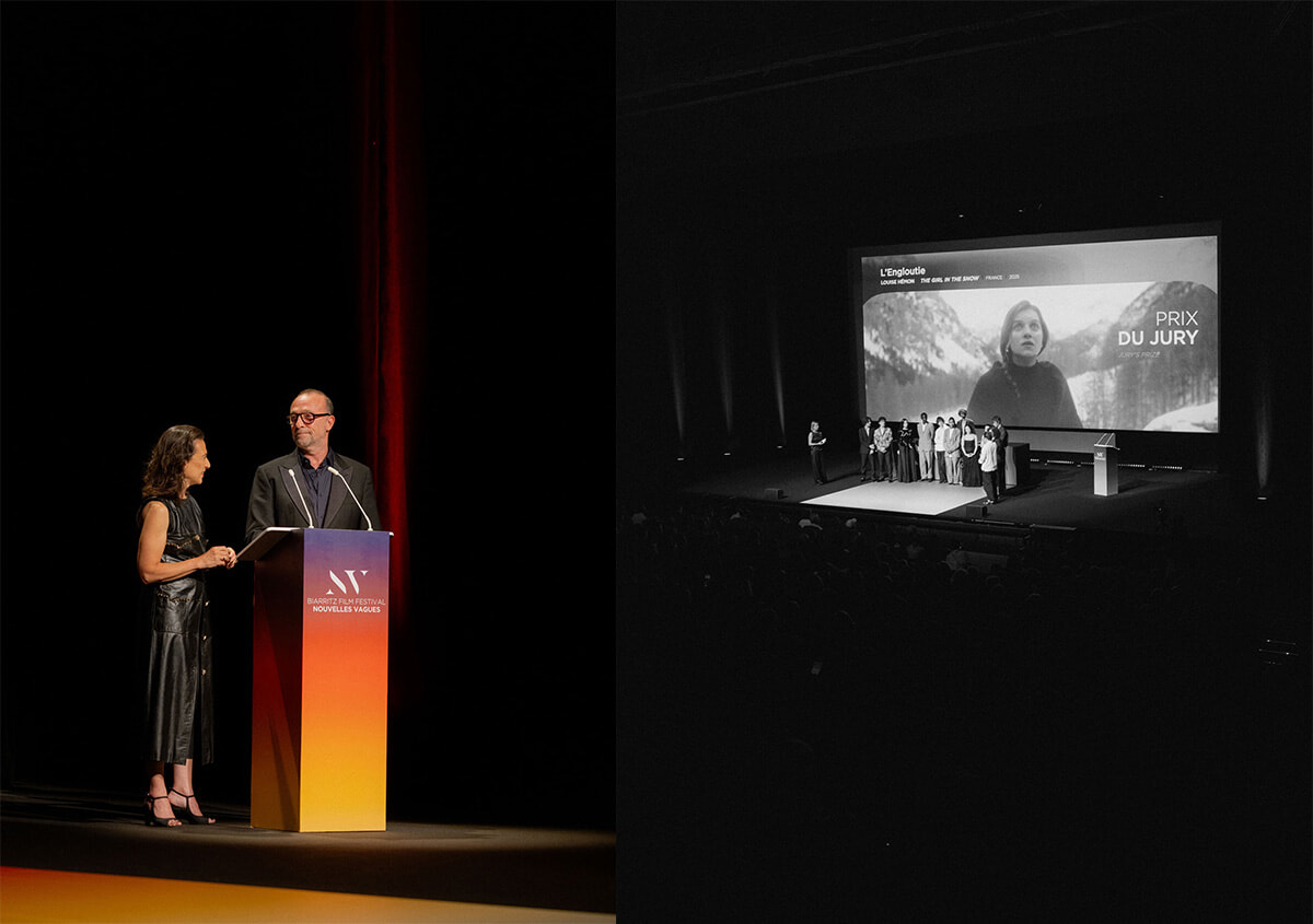 左:ビアリッツ映画祭Nouvelles Vaguesの共同創立者ジェローム・ピュリス(右)と総代のサンドリーヌ・ブラウア。第3回のクロージングセレモニーにて。 右:Louise Hémon監督『 L’Engloutie』第3回の審査員賞を受賞した。
