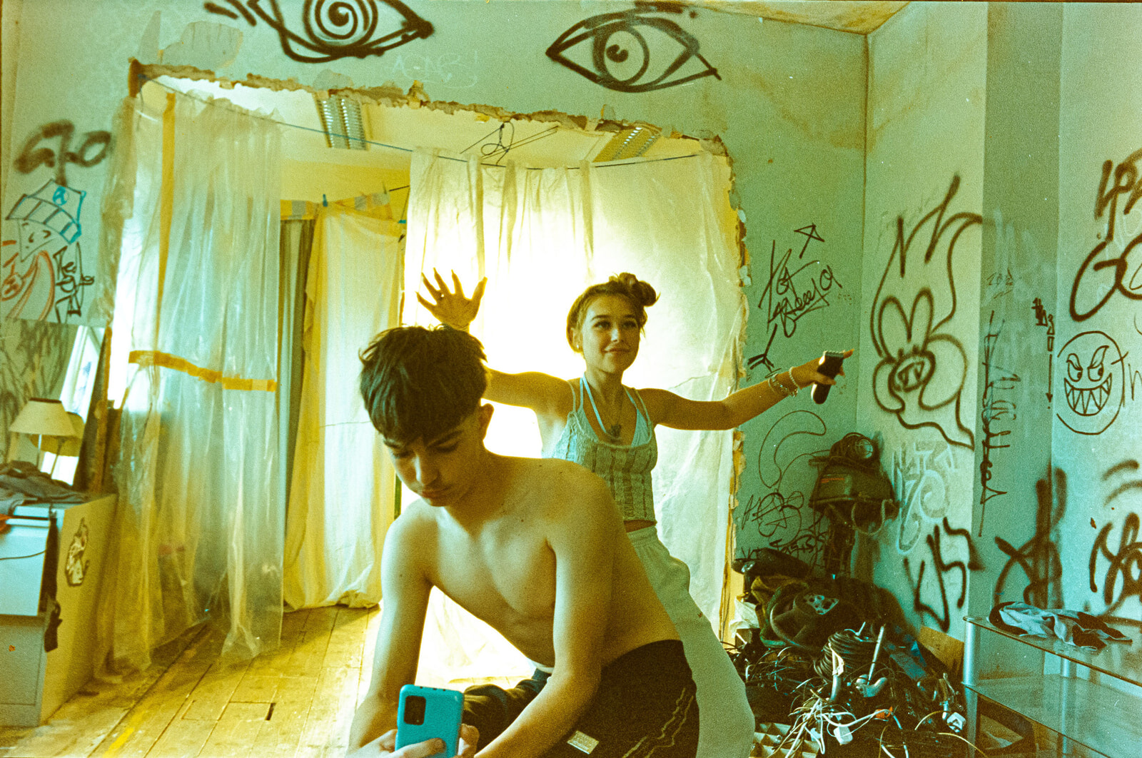 ブリアルは匿名性を重視し、音楽業界の「バンクシー」と呼ばれる存在だ。マーク・フィッシャー著の『わが人生の幽霊たち うつ病、憑在論、失われた未来』に2007年の発言として「誰にも知られないままでいたい。友達や家族のまわりにいるほうがいいし、俺が誰かなんてことに注目してほしくないんだ。俺が好きな曲はたいてい、どこのどんなやつが作ったかわからないようなものだった」とあるが、劇中のクレジットにも「Extra music by Burial」とだけ記され、曲名は明かされない。公営住宅の落書きやバスの窓に、バードがベイリーに伝える励ましの言葉「Don’t You Worry(心配するな)」が書かれているように、歌詞の断片――”Love Is Strange””You Don’t Care”といった短いフレーズ――も、ベイリーを励ますスピリット・ガイドのように機能している。