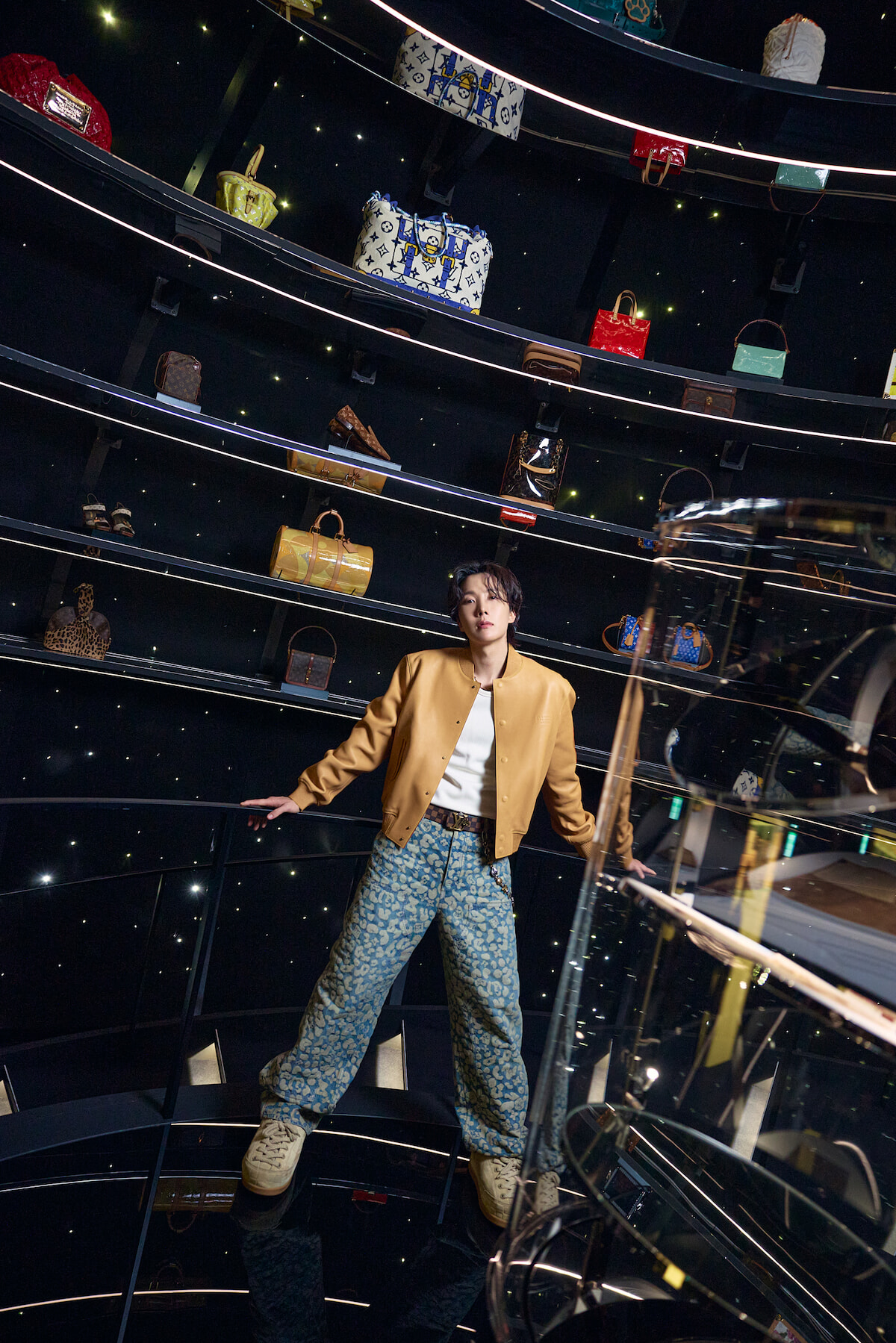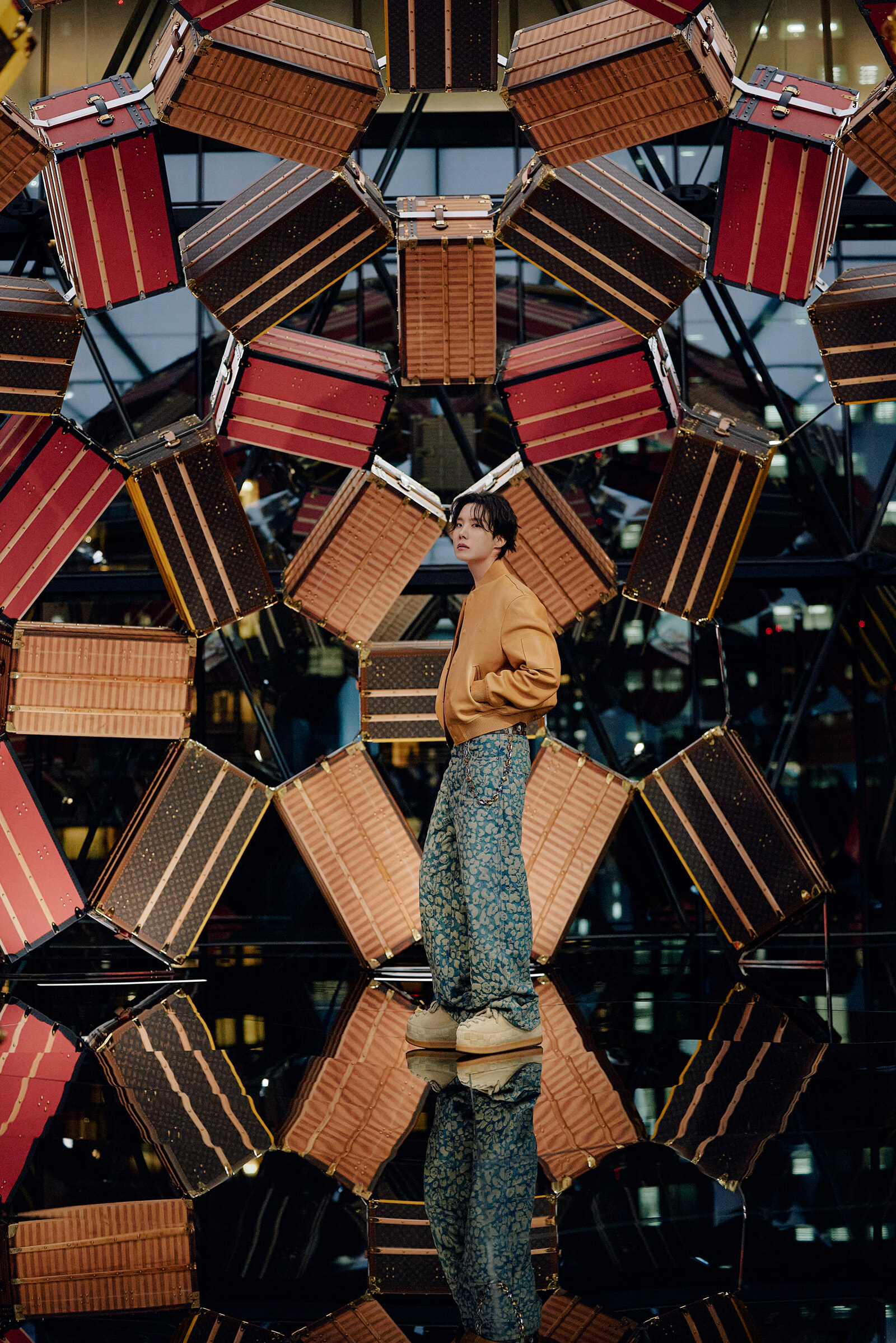 メゾンを象徴するトランクを球体のように構築した「トランクスケープ」と、吹き抜けのアトリウムに吊るされた和紙のトランクタワーの前でポーズを決めるj-hope。