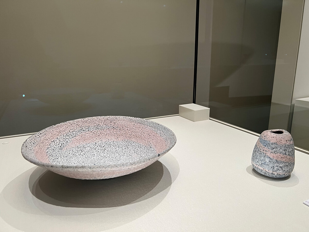 「《溶岩釉鉢》もぜひ取り上げたいと思います。表面の質感だけ取り出せば無骨ともいえる表現ですが、淡いピンクとグレーの色彩の効果もあり、とてもかわいらしいもの。《白釉ピンク線文鉢》も一推しです。伸びやかに開いた上部と極端に小さな高台という、一見不安定とも取れるフォルムの対比が見事に響き合っています。フォルムはすっきりとしていますが、決して冷たさを感じさせないのも、彼女の洗練された美意識の表れではないかと思います」