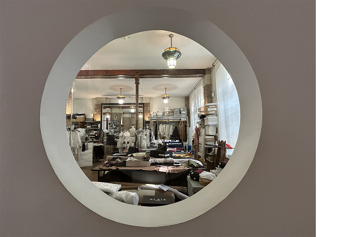 2階の展示スペースをお見逃しなく。アライアのアトリエが丸窓越しに見学できる。ブルース・ウェーバーの写真展もこのフロアで。