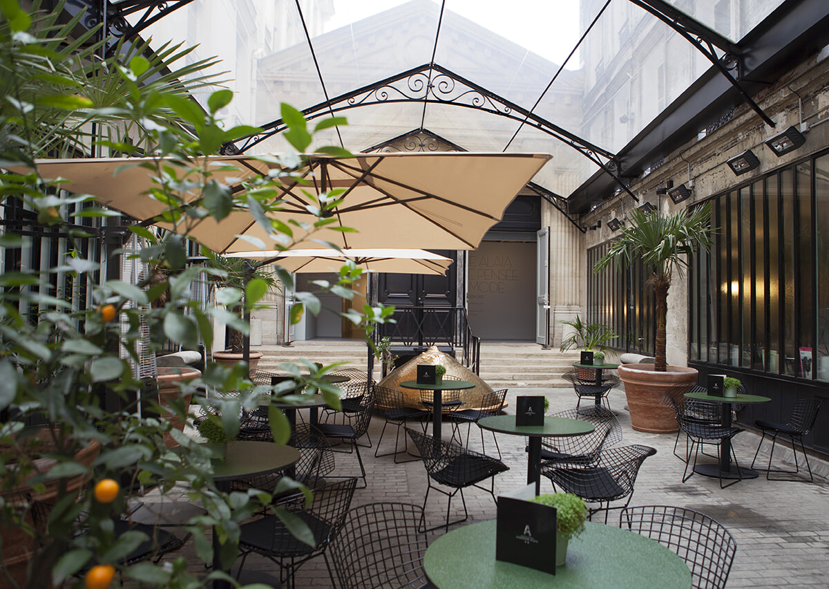 中庭のテラス席も気持ちいいカフェLe Aは、友人を招いて食事するのが好きだったアライアを偲んで。ランチタイムにはイタリアンが美味。営)11:00~23:00 休)月 © Sylvie Delpech