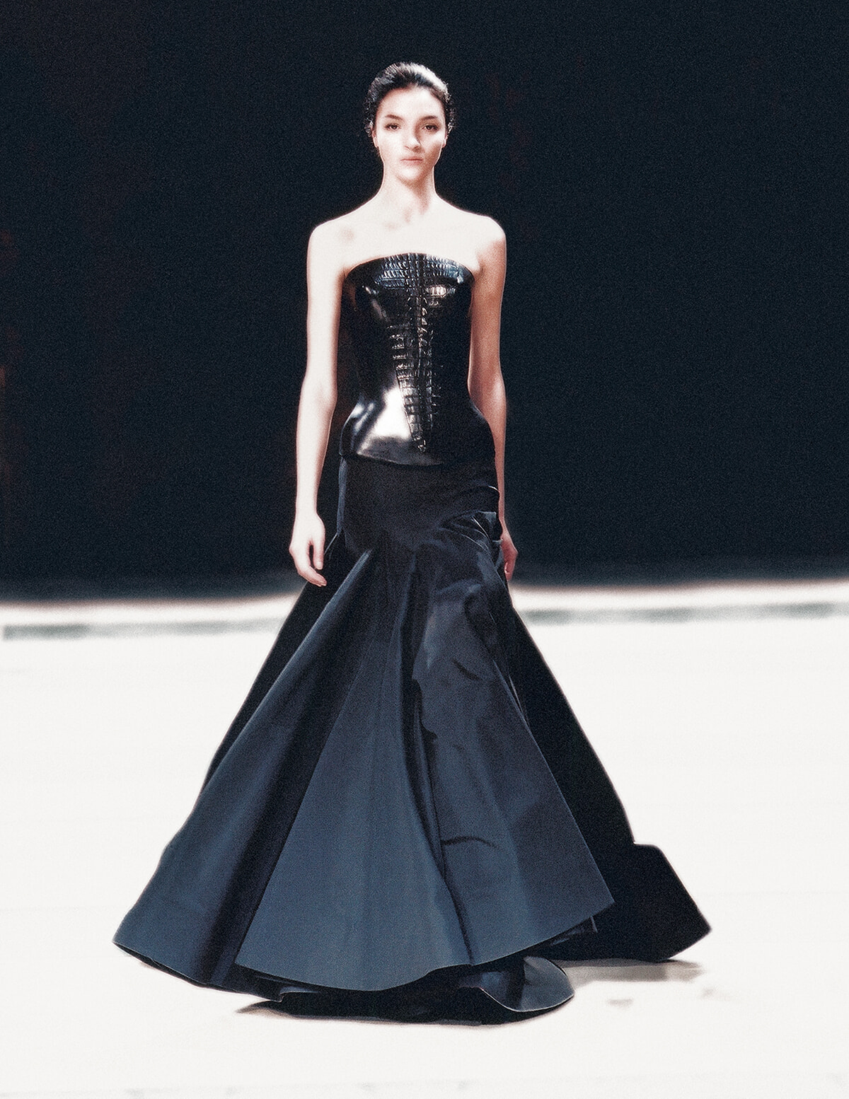 クロコダイルが嵌め込まれたレザーのビュスチエと大きくフレアが広がるスカートのコーディネート。アライアのカッティングが冴える。2003年夏コレクションより。© Ilvio Gallo