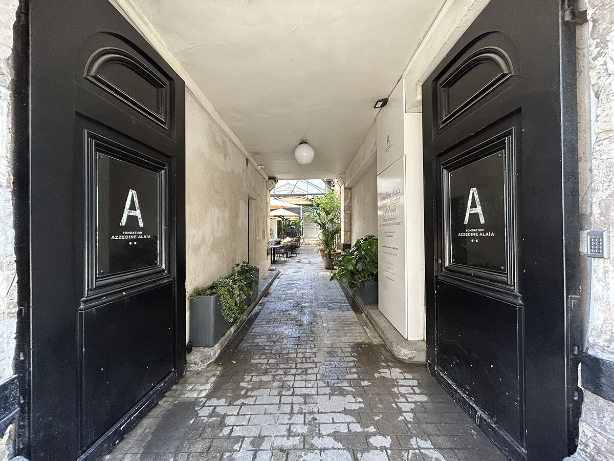 マレ地区にあるアズディン・アライア財団。ふたつのAのロゴをあしらった扉の向こうにカフェ、書店、展覧会スペースがある。