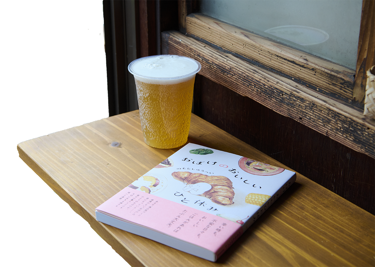 クラフトビール片手に本探しはいかが? 読書のためにアルコールと炭酸を控えめにした「リバーブックスペールエール」Mサイズ¥800。7月25日より展覧会開催予定の、のもとしゅうへいの最新刊『おばけのおいしいひと休み』(KADOKAWA刊¥1,485)。