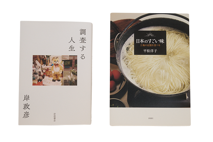 フィールドワークで知る豊かさの意味。左:社会学者・岸政彦と6人のフィールドワーカーたちとの人生にまつわる対談集。『調査する人生』(岩波書店刊¥2,530) 右:北海道から東京まで、食のエッセイスト平松洋子が出合った15の探訪記。『日本のすごい味ー土地の記憶を食べるー』(新潮社刊¥1,980)