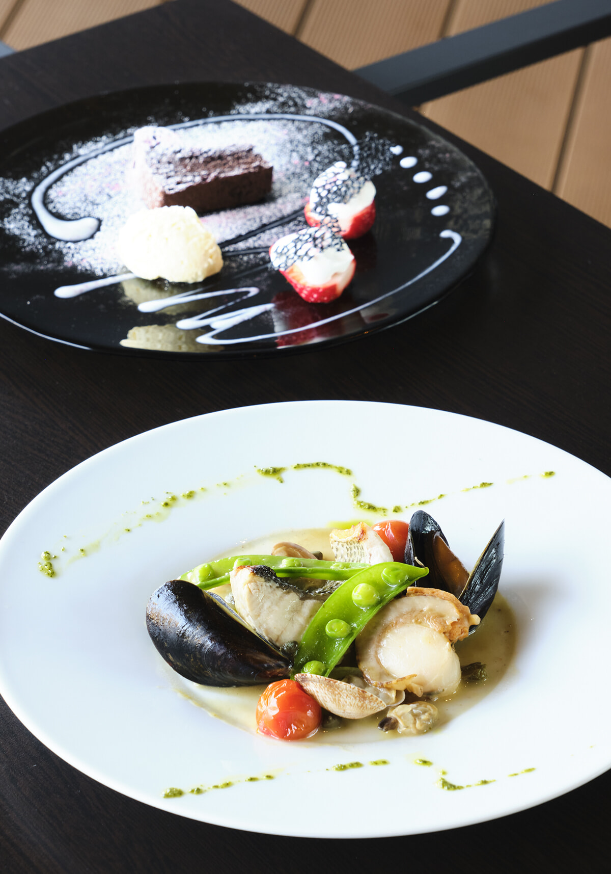 宿泊者の朝食会場でもあり、外来利用もできるレストランが3階に。¥5,500のディナーコースより、手前から「スズキのアクアパッツァ」「自家製ガトーショコラ」