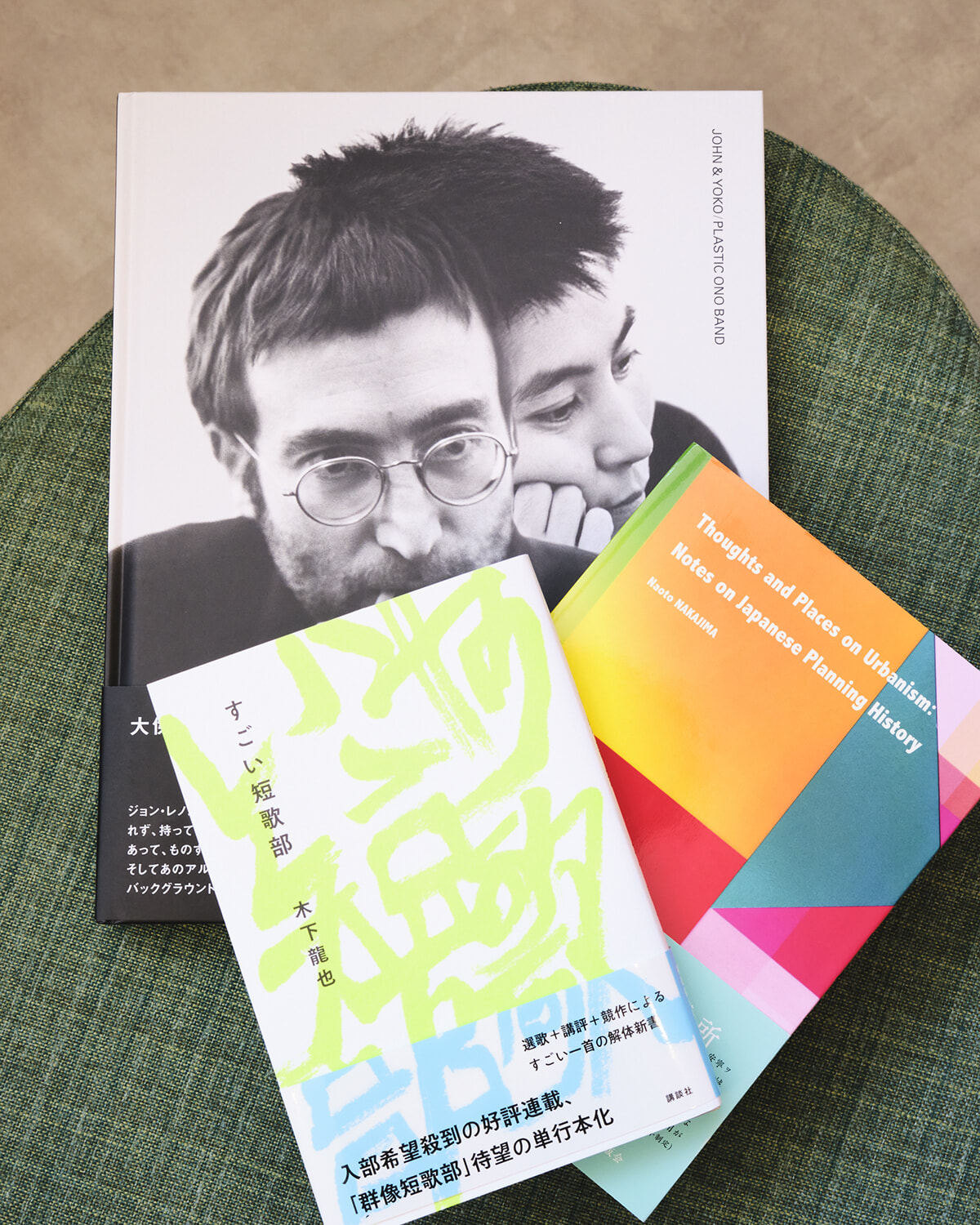 手前から、山口出身の歌人・木下龍也による『すごい短歌部』(講談社刊¥1,760)、『都市計画の思想と場所』(中島直人著 東京大学出版会刊¥4,840)、オノ・ヨーコがプロデュースを務めたレア本『JOHN & YOKO/PLASTIC ONO BAND』(ブループリント刊¥13,200)。