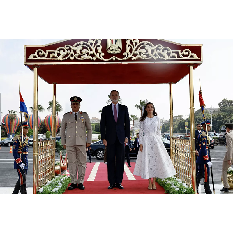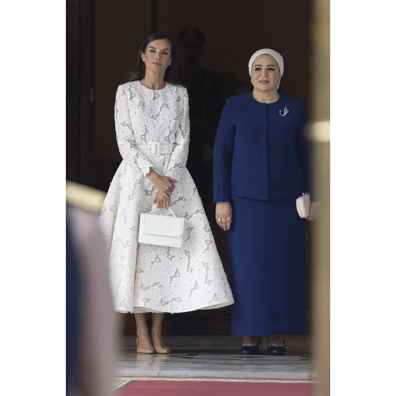 純白の王妃。9月17日(水)、カイロに到着したレティシア王妃は、花の刺繍が施された白いドレスに身を包んでいた。まるでブライダルドレスのような装いだった。王妃は夫フェリペ6世に同行し、3日間にわたるエジプト公式訪問を行った。滞在中、レオノール王女とソフィア王女の母である王妃は、一際注目を集めた。白を基調としたコーデを次々と披露。白を難なく着こなし、汚れを気にすることもなく堂々とした姿を見せた。