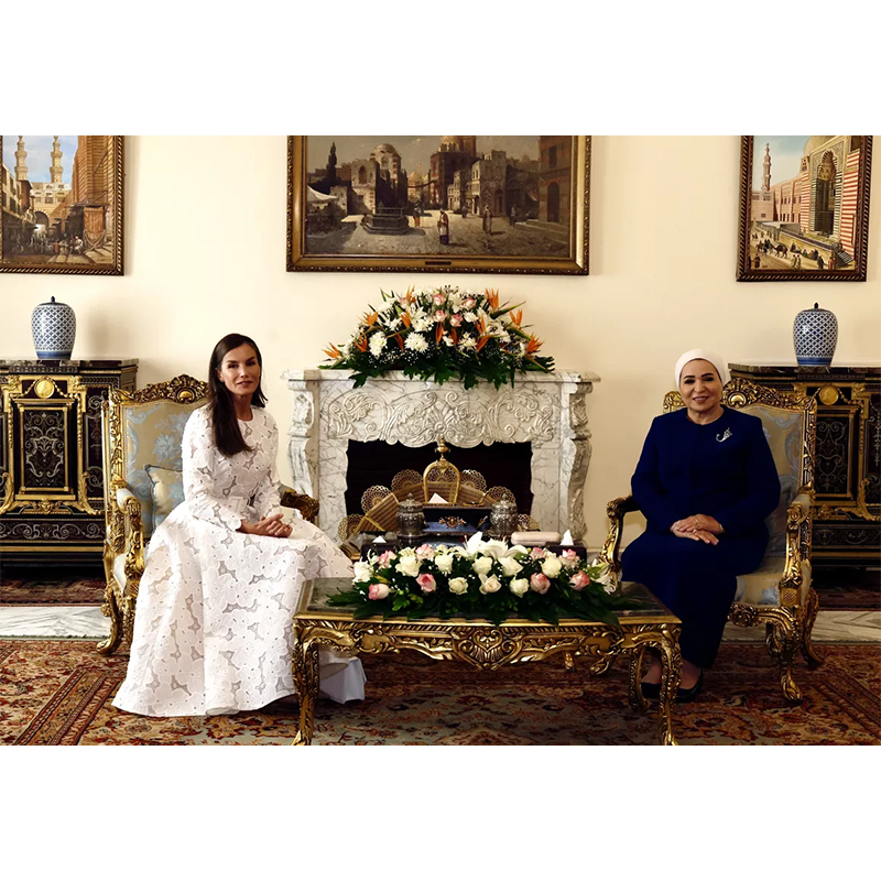 カイロに到着したレティシア王妃とフェリペ6世は、エジプトの首都でアブドルファッターフ・アッ=シーシー大統領とファーストレディのエンティサール・エルシーシ夫人にアル・イッティハディヤ宮殿で迎えられた。スペインブランド THE 2ND SKIN CO. のブライダルコレクションから選んだ真っ白なドレスに身を包んだ王妃は、カメラマンの前でポーズを取り、夫と共に到着時のプロトコルに沿って行動した。
