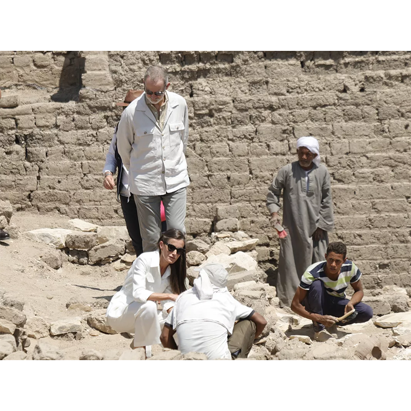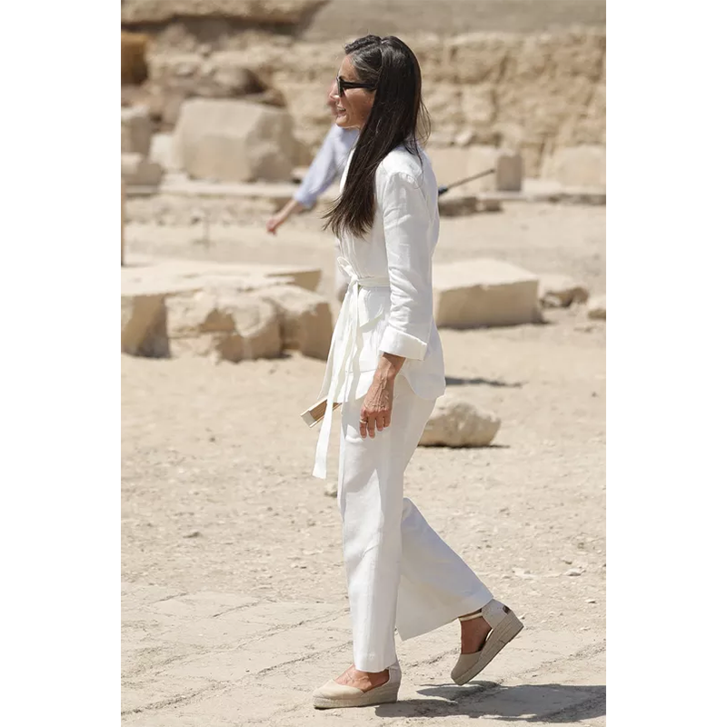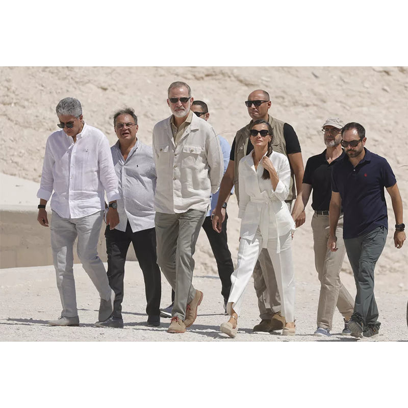 翌日、レティシア王妃は「死者の街」にあるスルタン財団での訪問を控えていたが、この日も白コーデを選んだ。王妃は、特に愛用するブランドMANGOのパンツスーツに、フランスのセザンヌの白いバレエシューズを合わせていた。エジプト滞在最終日には、レティシア王妃は最後の純白コーデを披露した。王妃はキャロリーナ ヘレラのリネン素材のジャケットとパンツのセットアップに、ウェッジヒールのエスパドリーユを合わせ、夫フェリペ6世に同行してルクソール博物館を訪れた。考古学者の案内で、王夫妻は発掘現場を見学することができた。その後、国王夫妻は多くのファラオの墓がある王家の谷を訪れた。王家の谷の石と黄金の砂に囲まれた中で、王妃は淡く輝く白コーデで人々の視線を集めた。