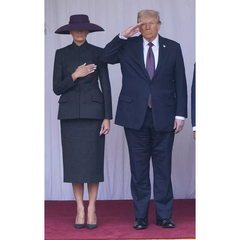 9月17日、イギリスのウィンザー城の芝生を歩くメラニア夫人を見て、なんだかミステリアスな雰囲気だなと感じなかっただろうか。この日、ウィリアム皇太子とキャサリン皇太子妃の出迎えを受けたメラニア夫人は米国大統領専用ヘリ「マリーンワン」からゆっくり降りてきた。ディオールのウールスーツを着た大統領夫人は大きな紫のカプリーヌハットをかぶっており、顔がほとんど見えなかった。