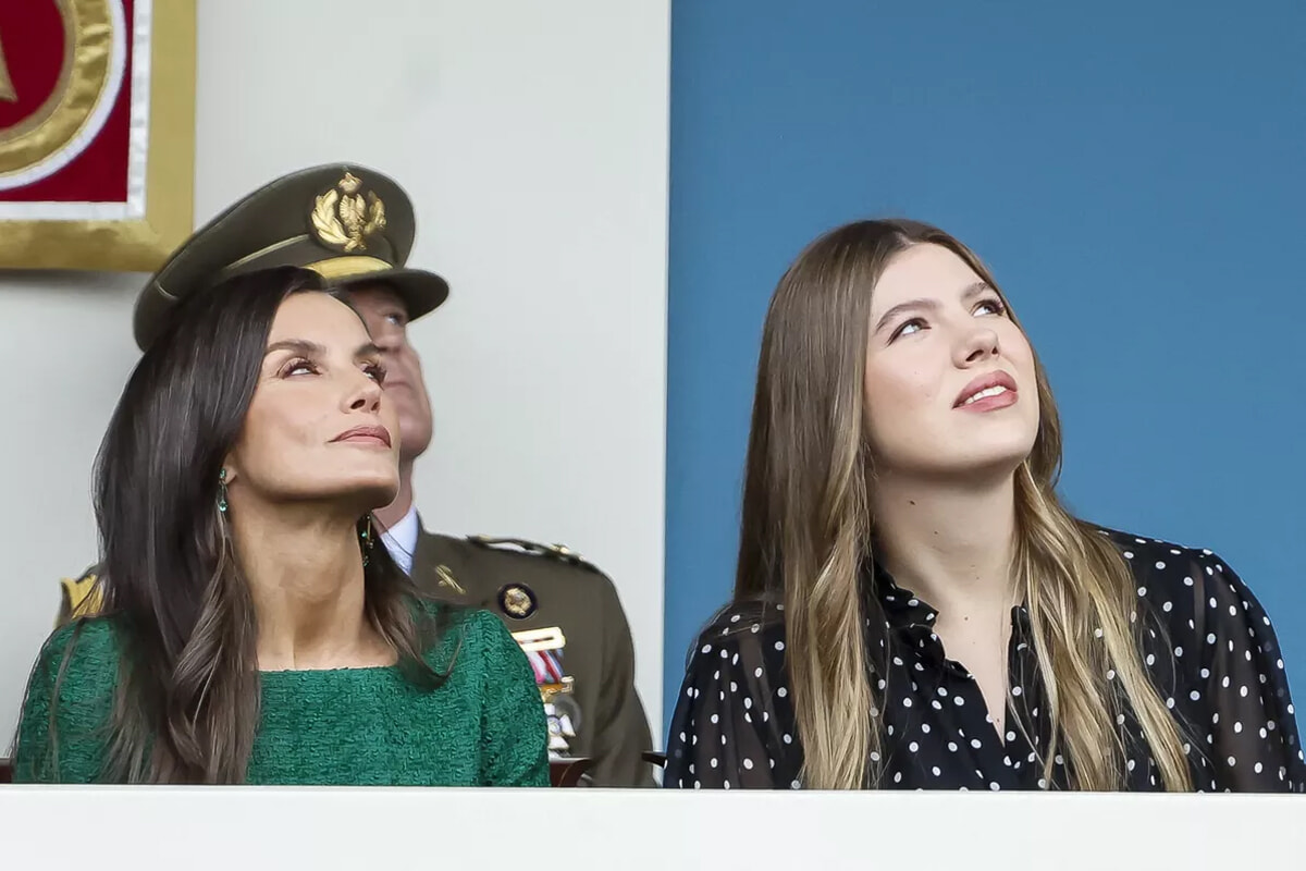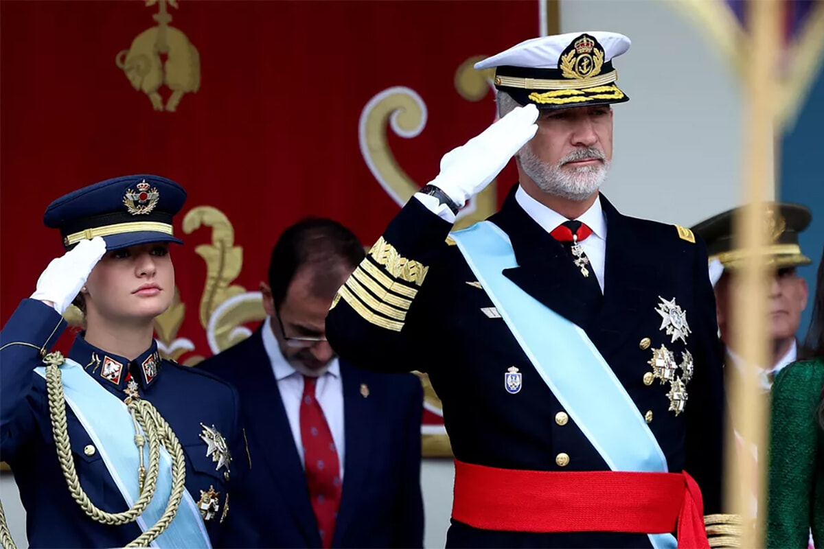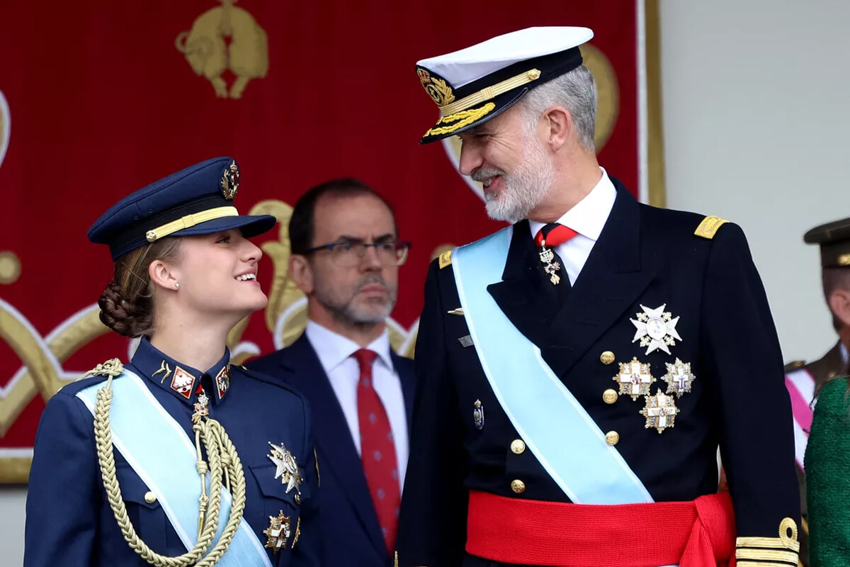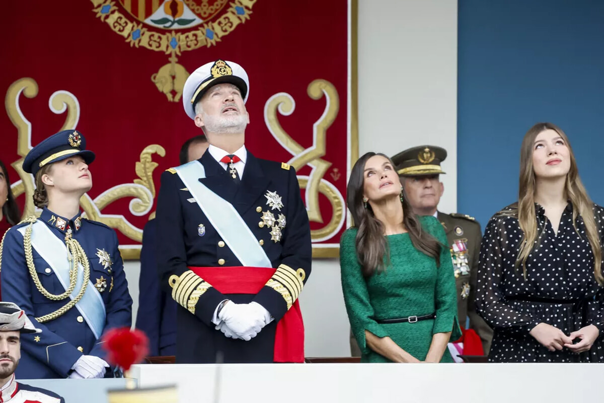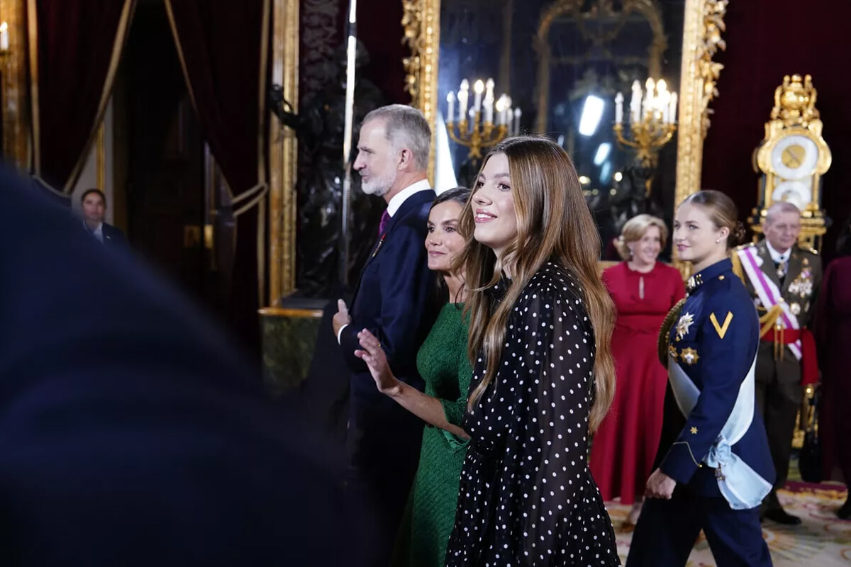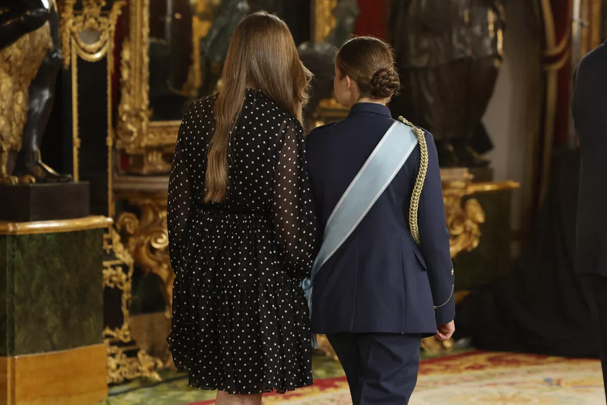 儀礼に従い、レティシア妃とソフィア王女は、並んで立つフェリペ6世国王とレオノール王太女の左側に立った。4人がこの順番になるのは2020年以来のことだ。2021年と2022年は国際バカロレア取得のためにレオノール王女がウェールズで学んでいたため不在だった。その翌年と翌々年は、今度は妹のソフィア王女が同じ学校に通っていたため、不在だった。