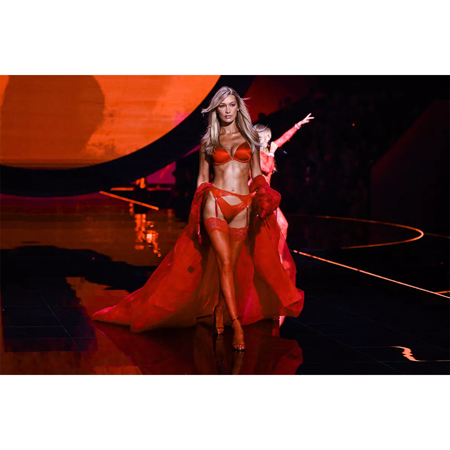 健康上の問題により、ここ数シーズンはファッションウィークを欠席していたベラ・ハディッドが、2度のランウェイ登場でセンセーションを巻き起こした。1回目は、赤い情熱的なランジェリーのセットアップに、ガーターストッキングと同色のふんわりスカートを合わせたスタイル。2回目は、全身スパンコールの衣装に、白く大きな翼をあしらったルックで登場した。姉のジジも共に登場し、キャンディピンクのレースビスチェに花びらを模したロングコートをまとってランウェイを歩いた。