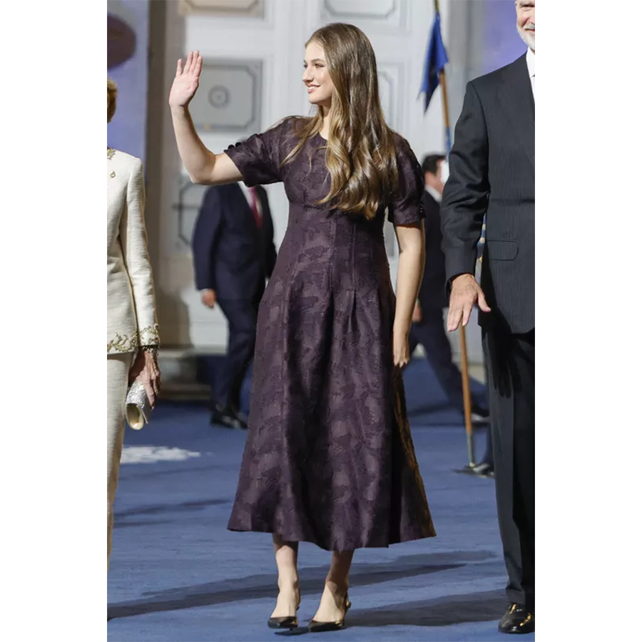 両親であるスペイン国王フェリペ6世とレティシア王妃、妹のソフィア王女、そして祖母のソフィア王太后に囲まれながら、レオノール王女はこのイベントのブルーカーペットでひときわ注目を集めた。文学賞の授与式に臨むため、スペイン王位継承者である彼女はいつものパンツスーツを封印し、H&Mのバイオレット色のジャカード柄ミディドレスを選んだ。そのドレスはわずかにフレアが入ったエレガントなデザインだった。