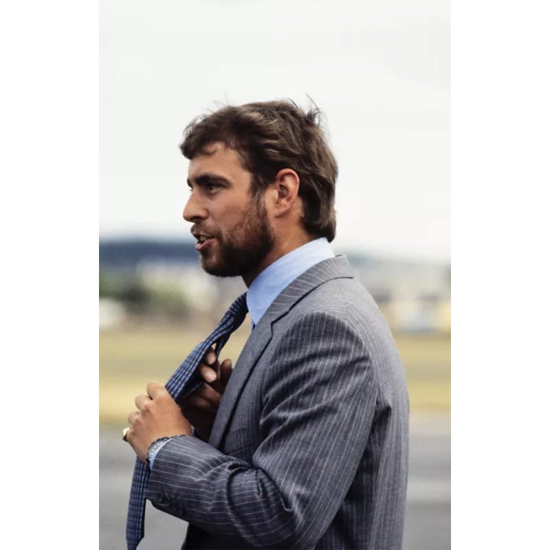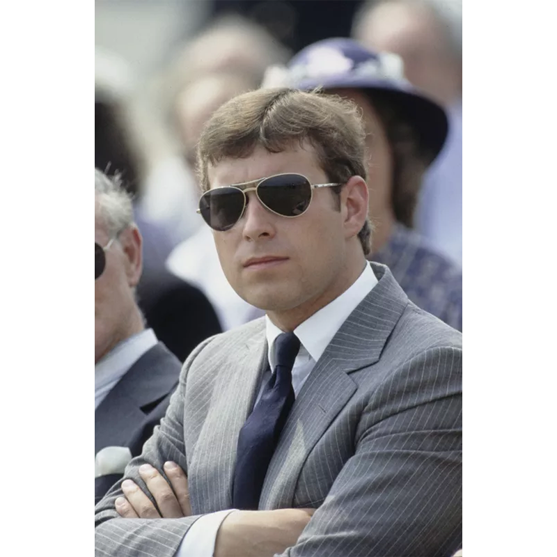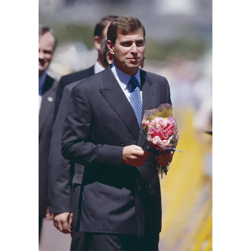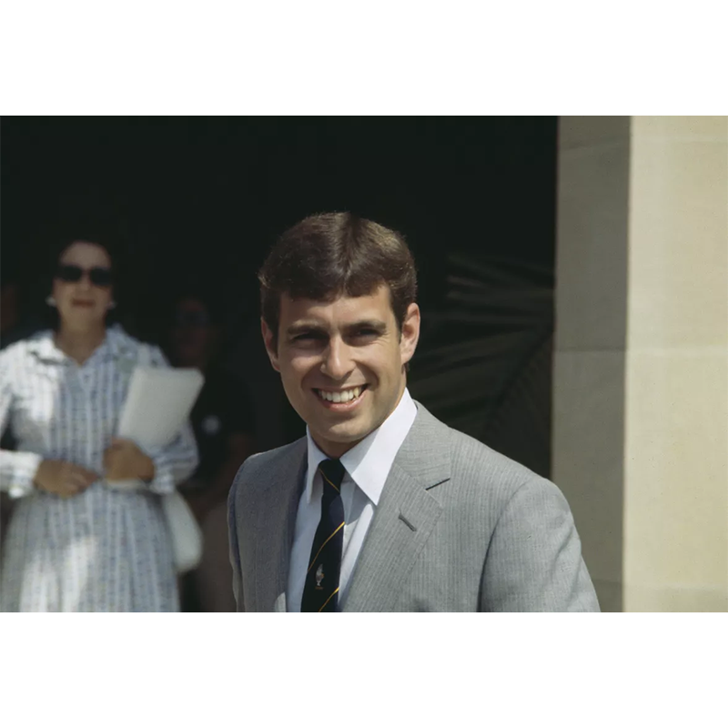 1985年、グレーのスーツ姿のアンドルー王子。