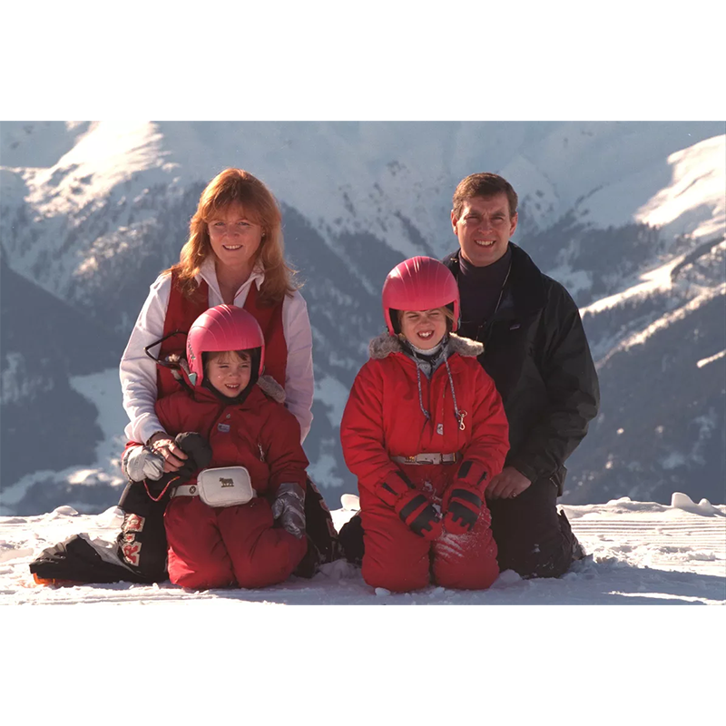 アンドルー王子、セーラ・ファーガソン、ベアトリス王女、ユージェニー王女、1997年2月、4人で冬のバカンスを過ごした。