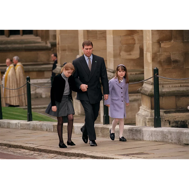 アンドルー王子とベアトリス王女、ユージェニー王女、1999年4月4日、ウィンザーでのイースター礼拝に出席。