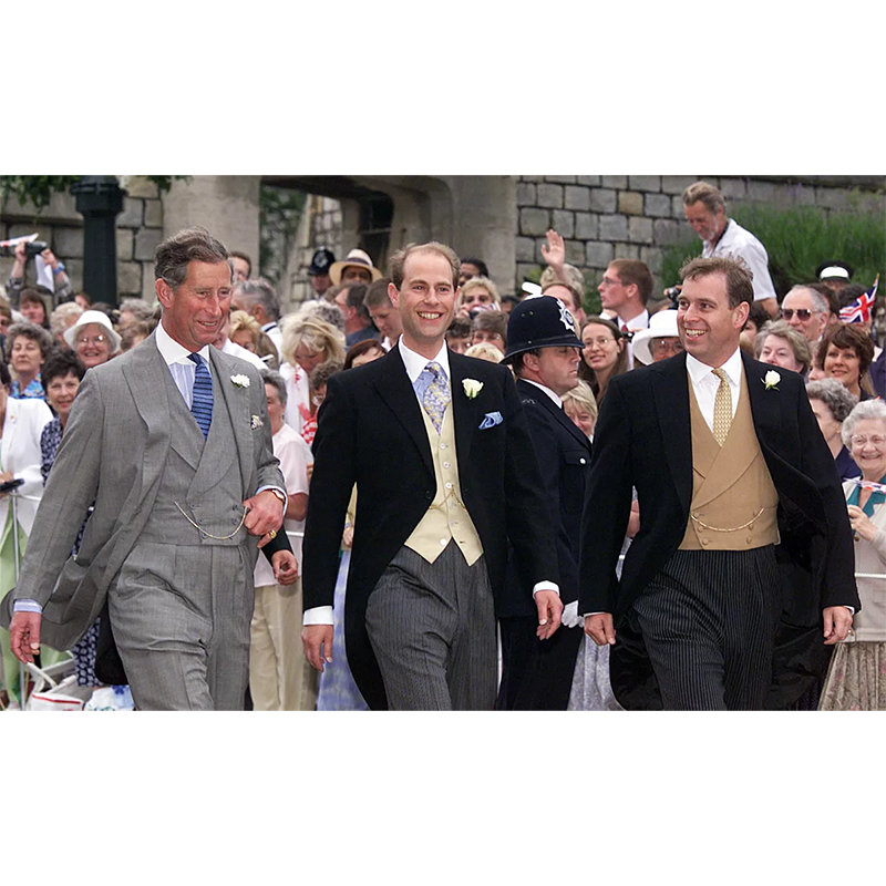 アンドルー王子、チャールズ王太子、エドワード王子、1999年6月19日、ウィンザーのセント・ジョージ礼拝堂で行われたエドワード王子の結婚式に出席。