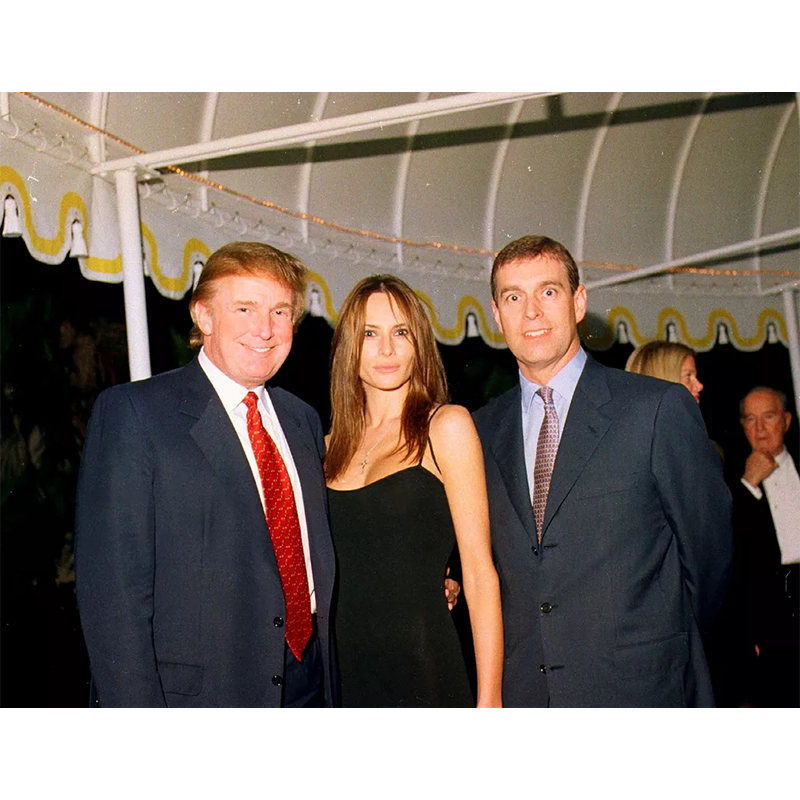 アンドルー王子、ドナルド・トランプ、メラニア・クナウス、2000年2月12日、フロリダ州パームビーチのマー・ア・ラゴ・クラブでのパーティーにて。後のメラニア・トランプとともに。