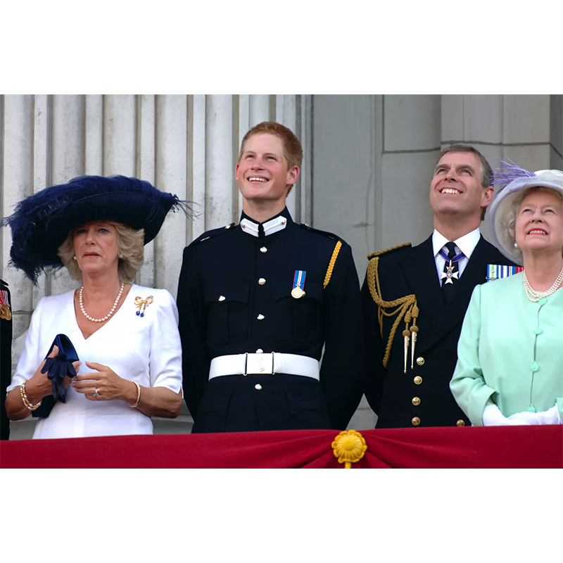 アンドルー王子、カミラ・パーカー・ボウルズ、ハリー王子、エリザベス女王、2005年7月10日、ロンドンのバッキンガム宮殿のバルコニーにて。