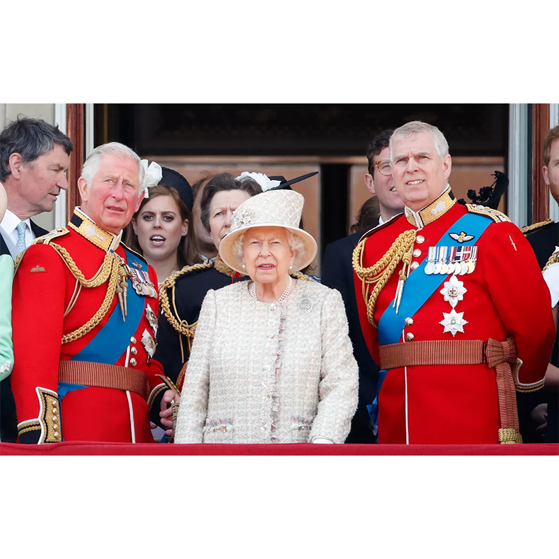 アンドルー王子、チャールズ王太子、エリザベス女王、2019年6月8日、ロンドンのバッキンガム宮殿のバルコニーで。年に一度の「トゥルーピング・ザ・カラー」閲兵式に出席。