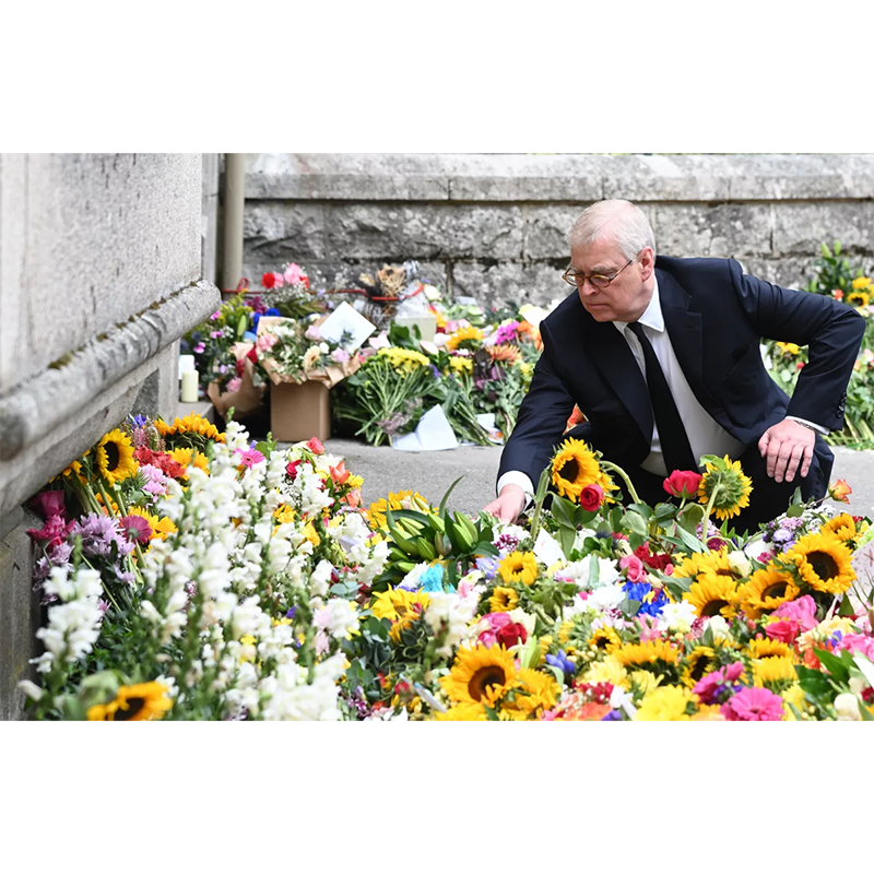 2022年9月8日のエリザベス女王崩御後、スコットランドのバルモラル城前に供えられた花々を見つめるアンドルー王子。