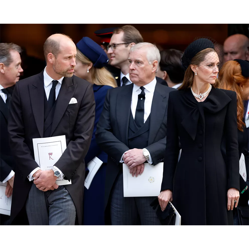アンドルー王子、ウィリアム皇太子、キャサリン皇太子妃、2025年9月16日、ロンドンのウェストミンスター寺院で行われたケント公爵夫人の葬儀に出席。